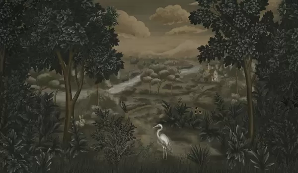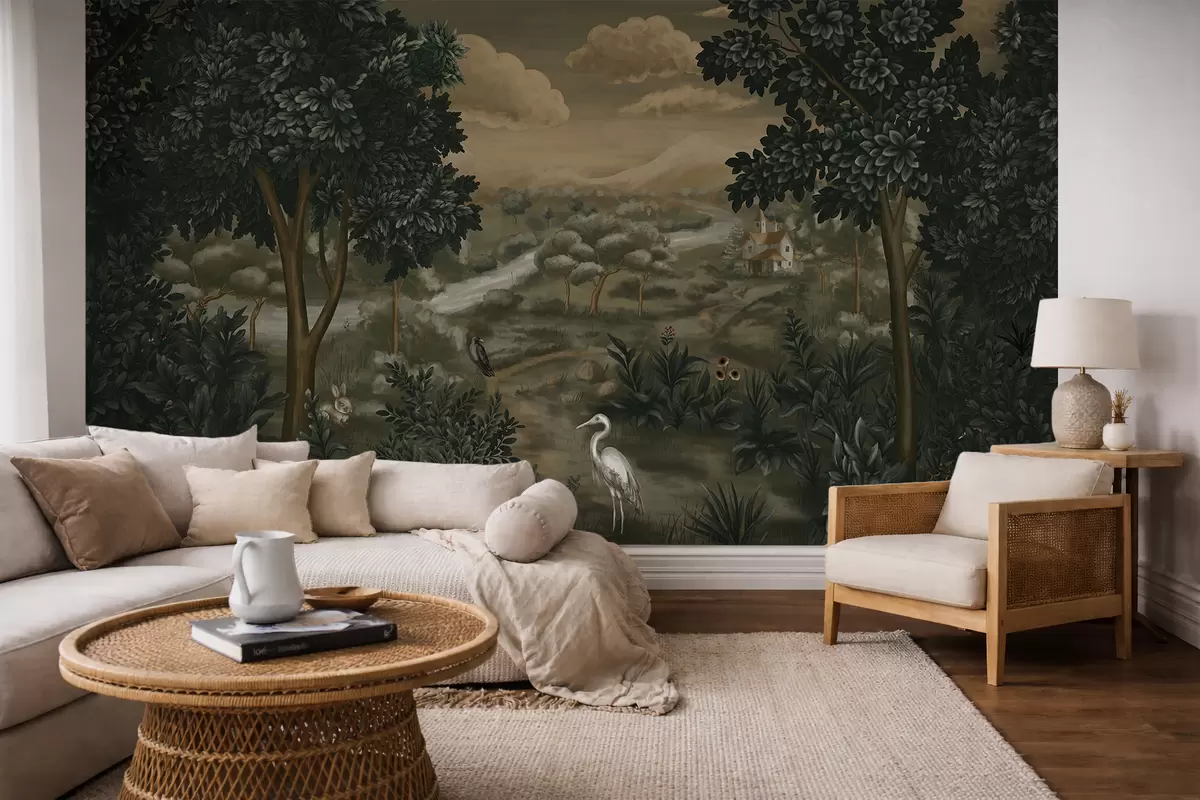 Fototapetai Fantazijos peizažas su upe, namu ir paukščiais tarp medžių Nr. w05090