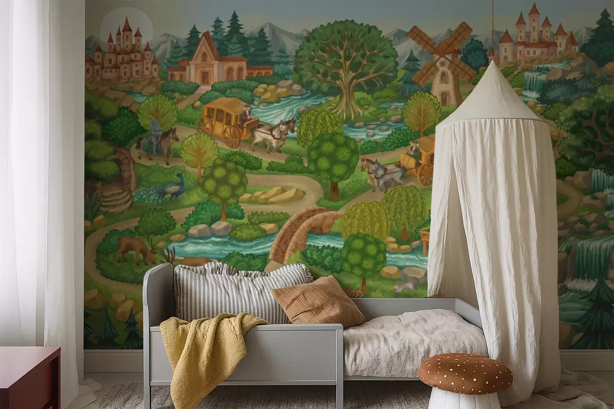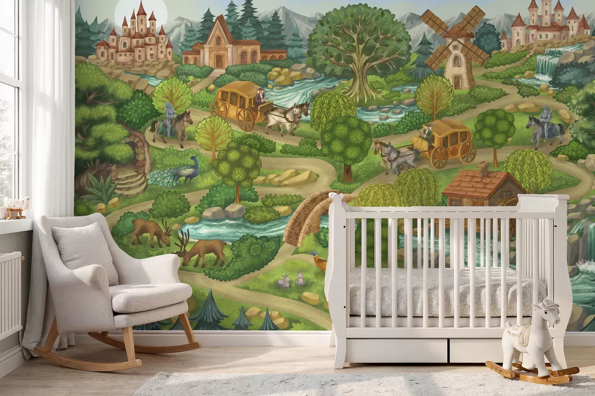 Fototapetai Pasakų iliustracija su pilimis, mišku, upėmis ir keliautojais Nr. w05091v1