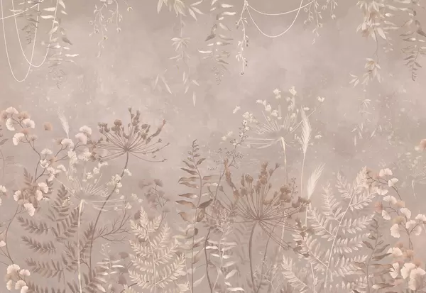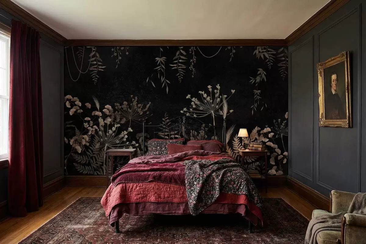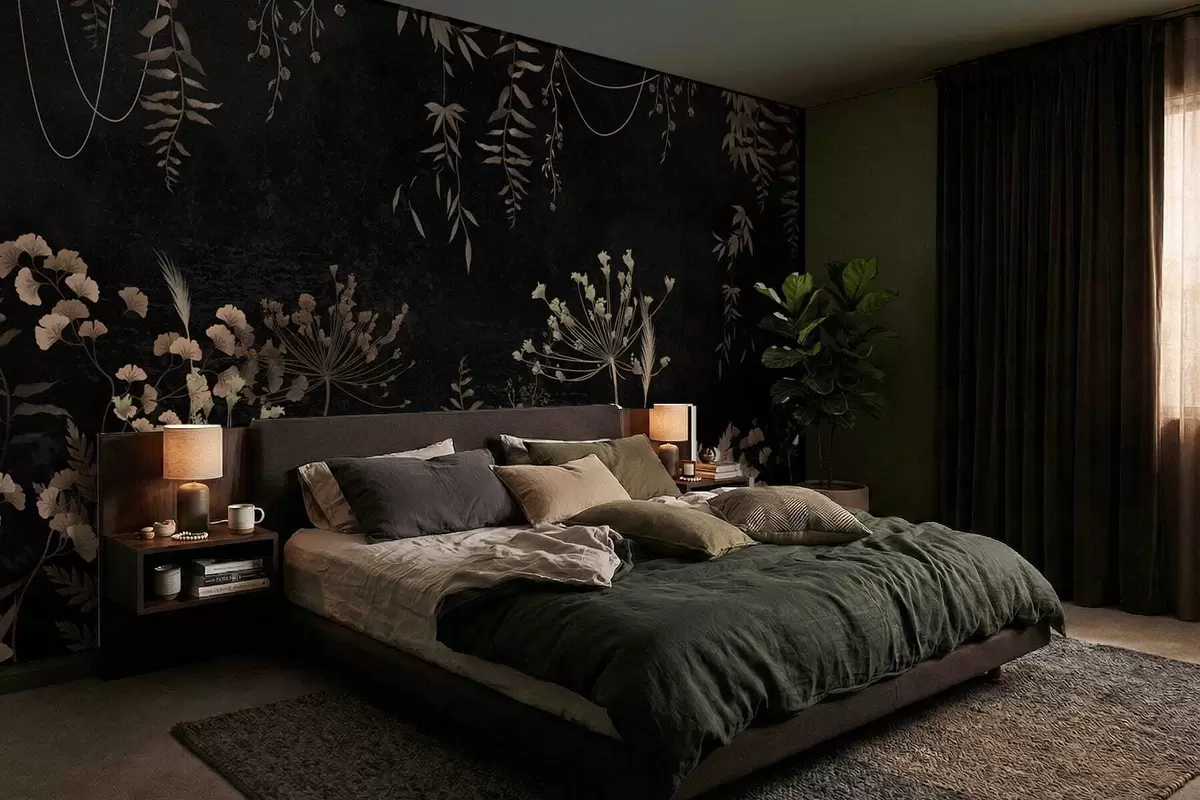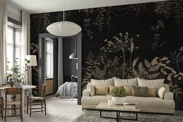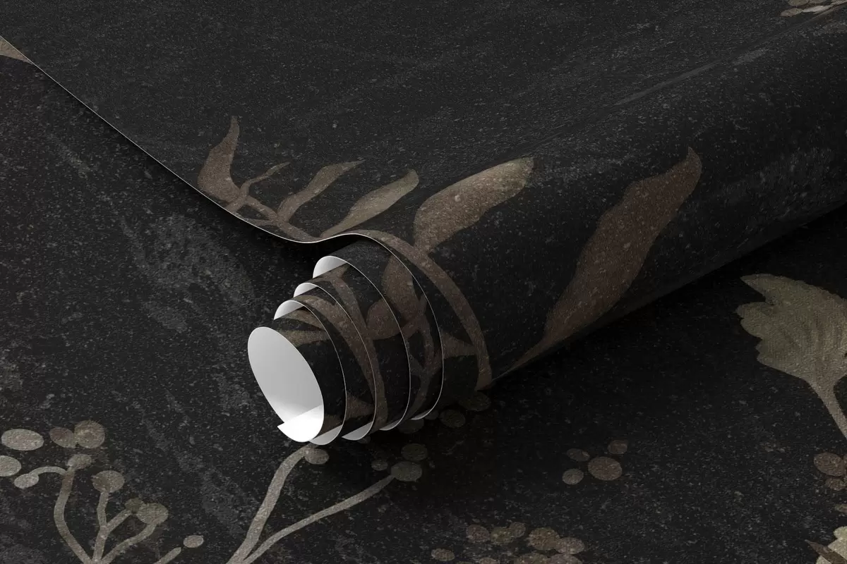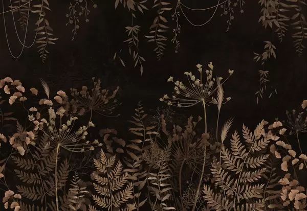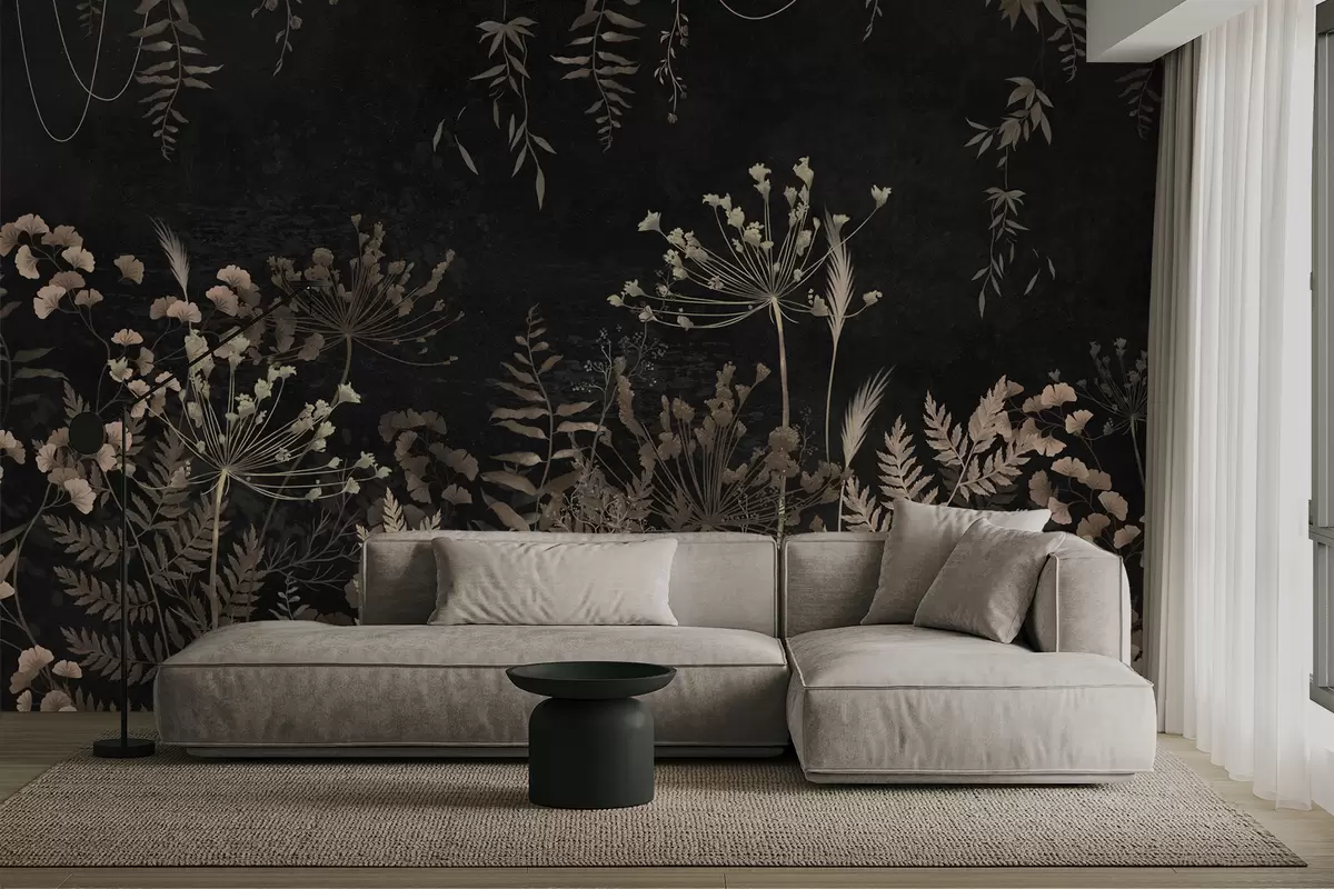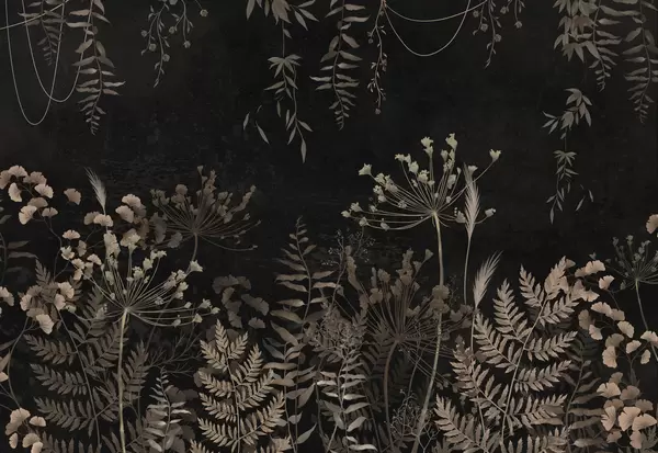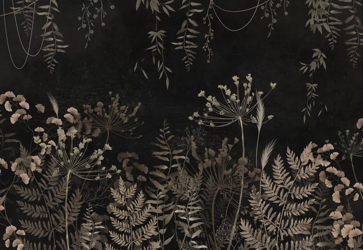 Fototapetai Tamsus botaninis raštas su gėlėmis ir lapais Nr. w05092