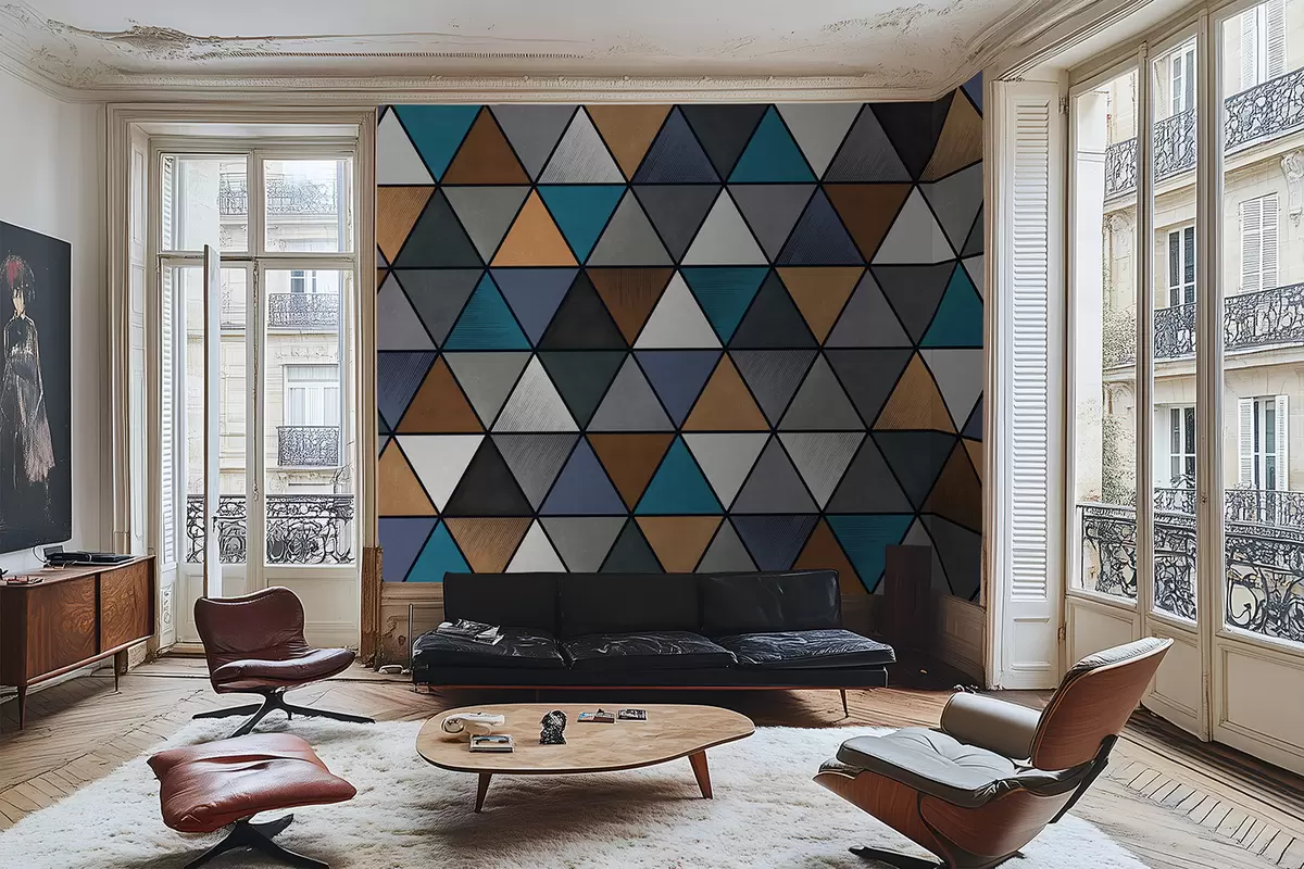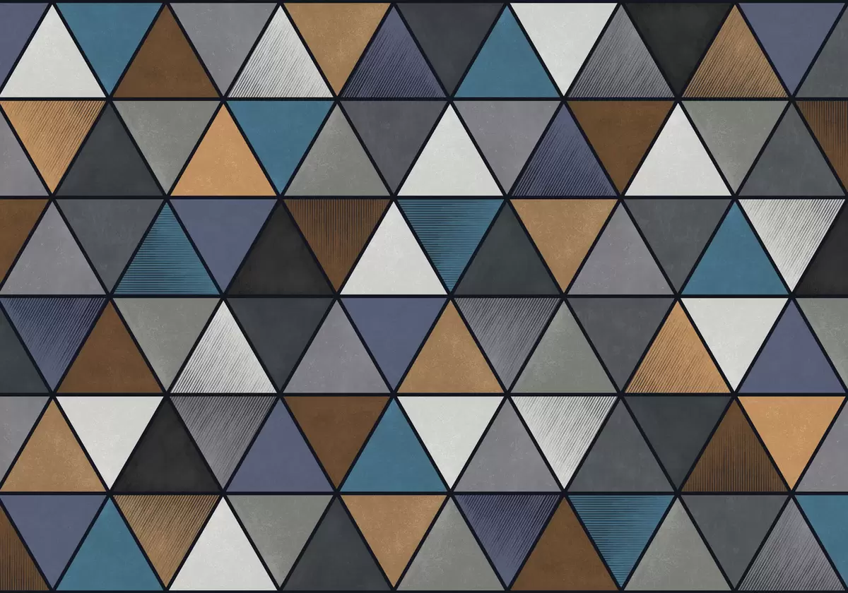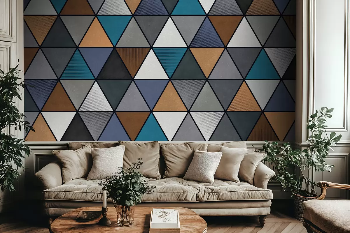 Fototapetai Mėlynos ir šiltų atspalvių trikampis geometrinis raštas Nr. w05095