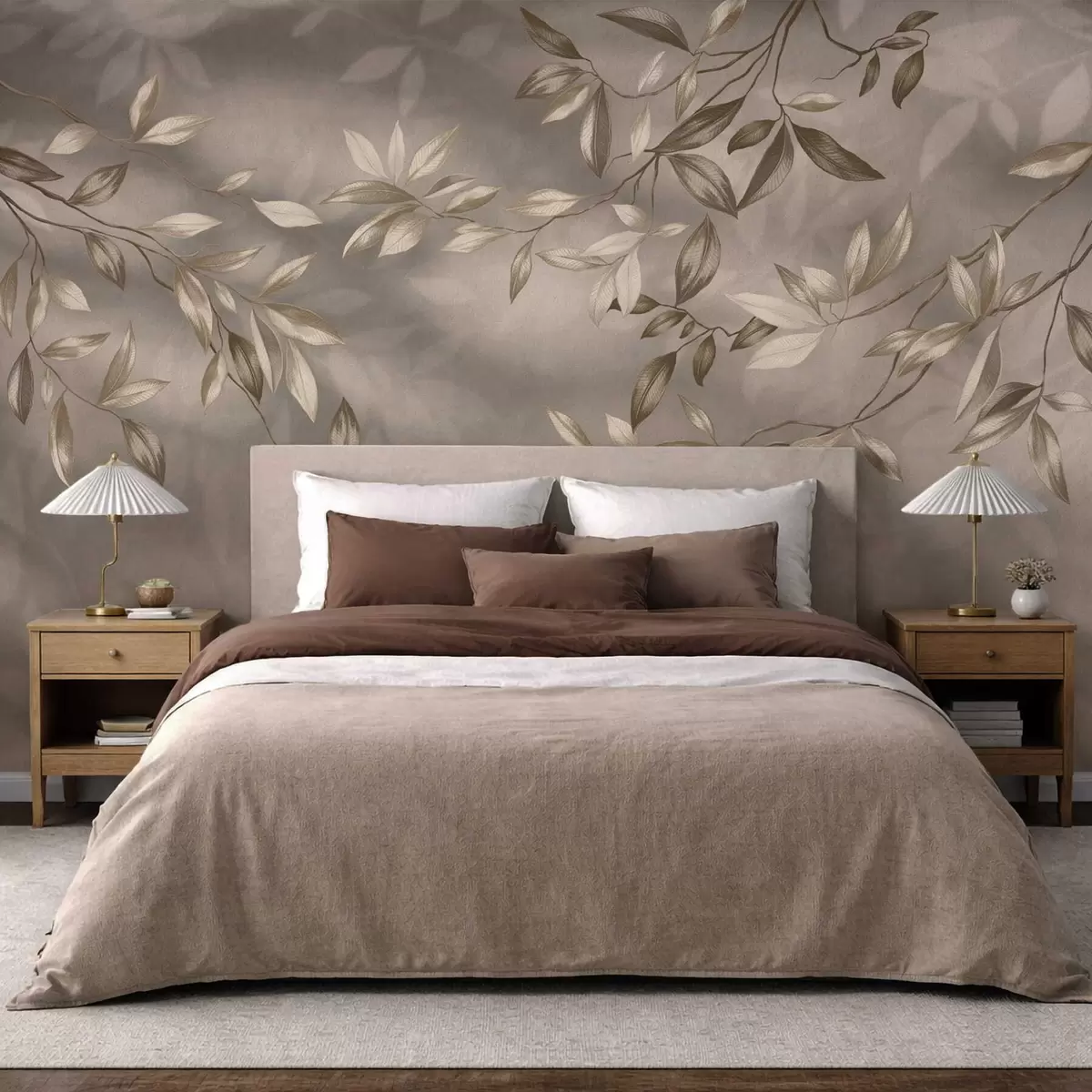 Fototapetai Subtilūs lapoti šakeliukai smėlio atspalvių ant šviesaus fono Nr. w05113v2