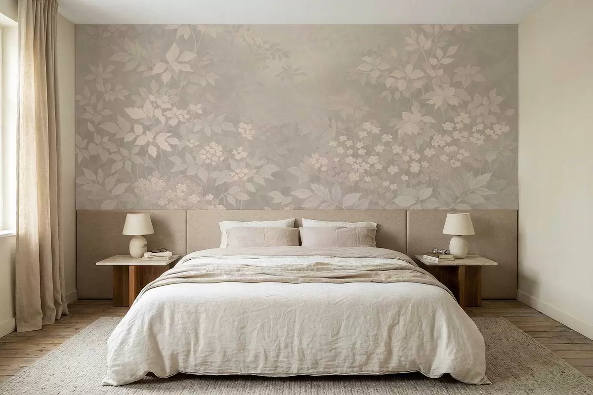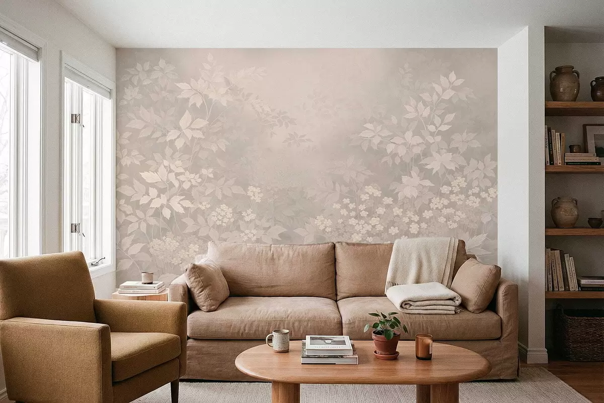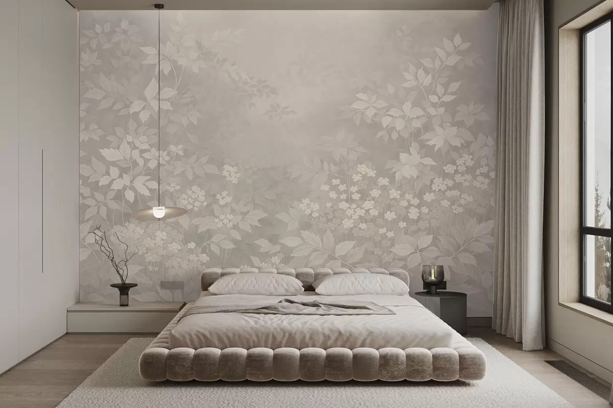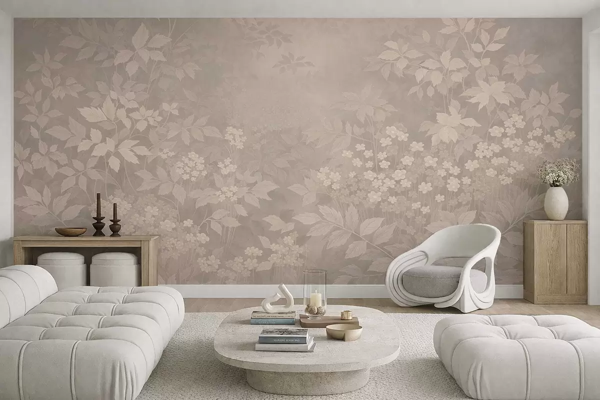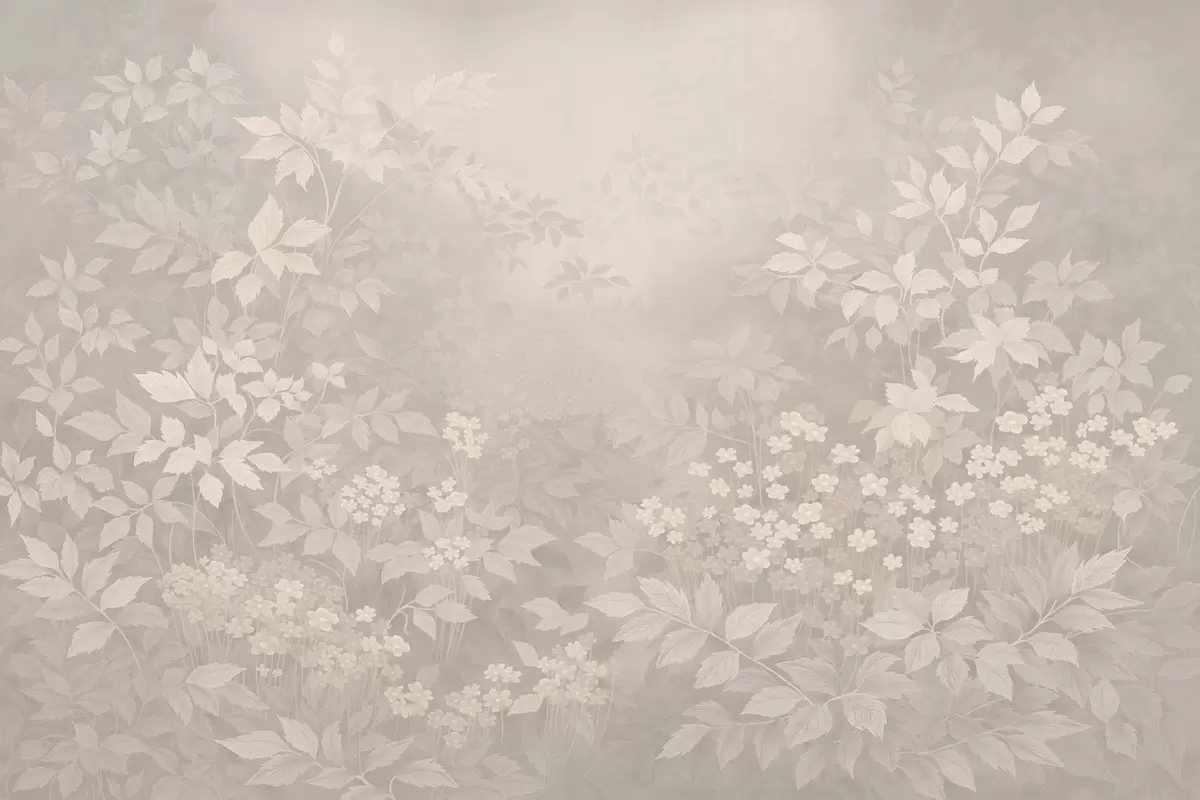 Fototapetai Švelnus botaninis raštas su lapais ir gėlėmis rūke Nr. w05115v1