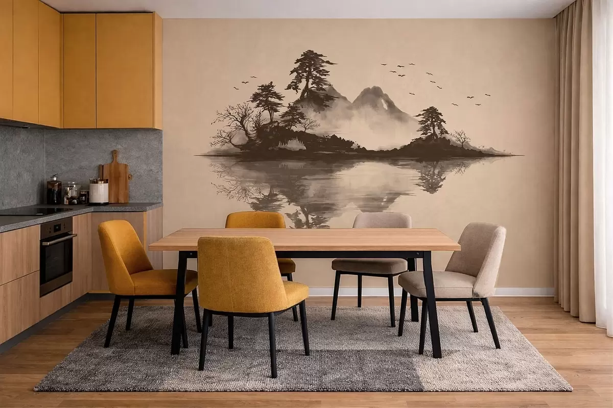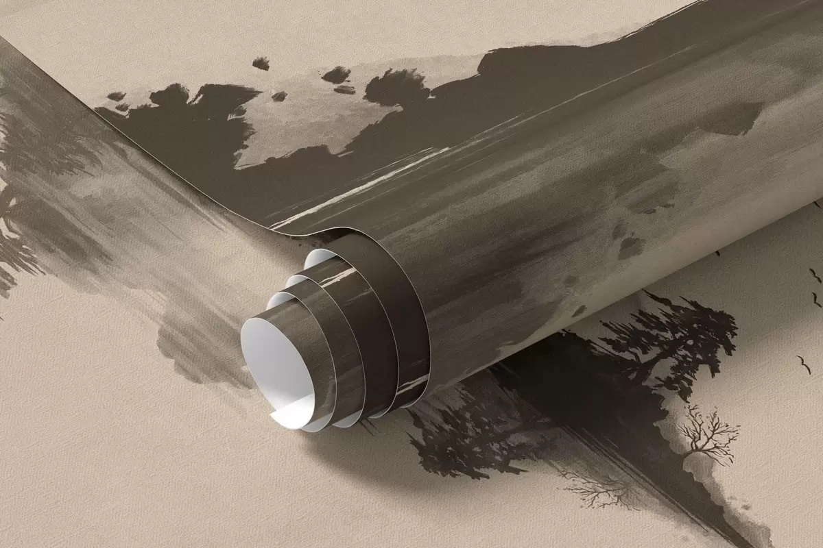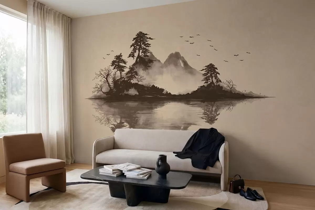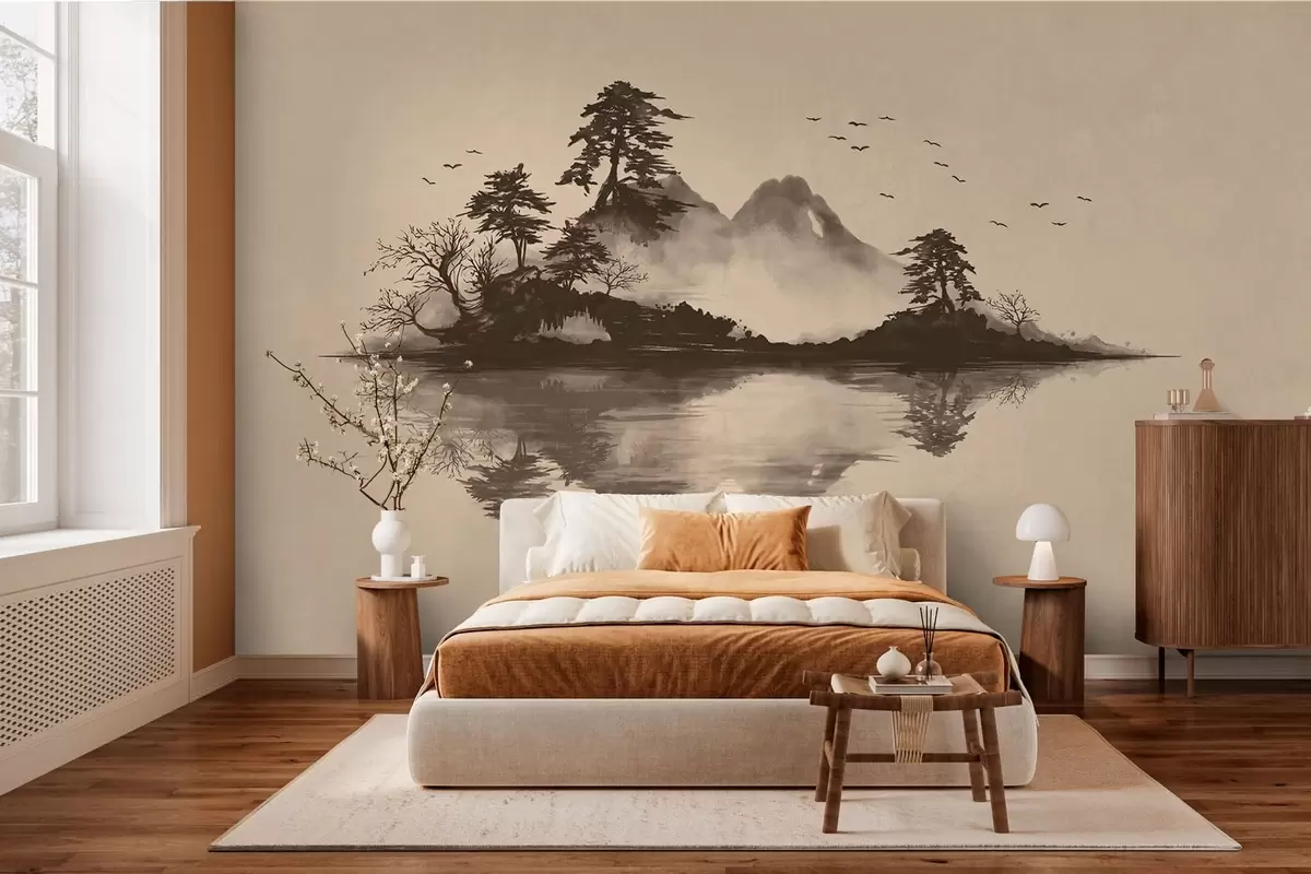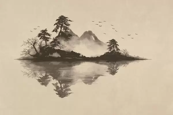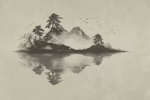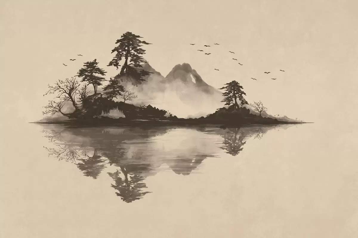 Fototapetai Sumi-e kalnų peizažas su pušimis ir atspindžiu Nr. w05124