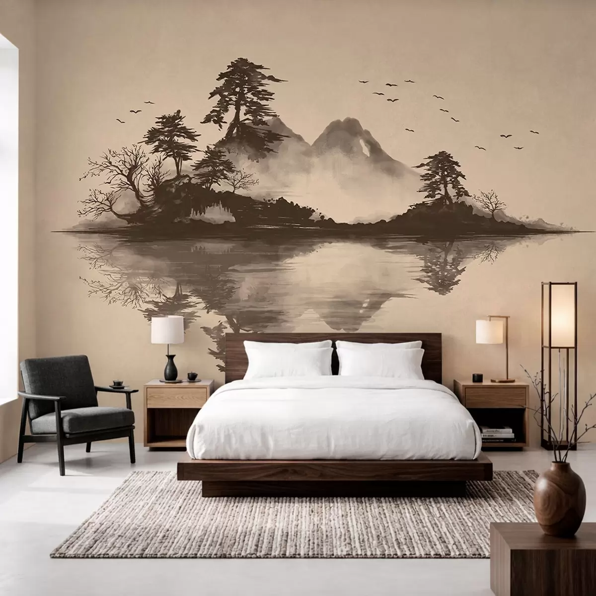 Fototapetai Sumi-e kalnų peizažas su pušimis ir atspindžiu Nr. w05124