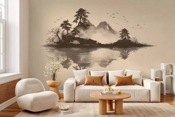 Fototapetai Sumi-e kalnų peizažas su pušimis ir atspindžiu Nr. w05124