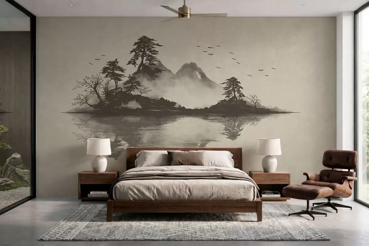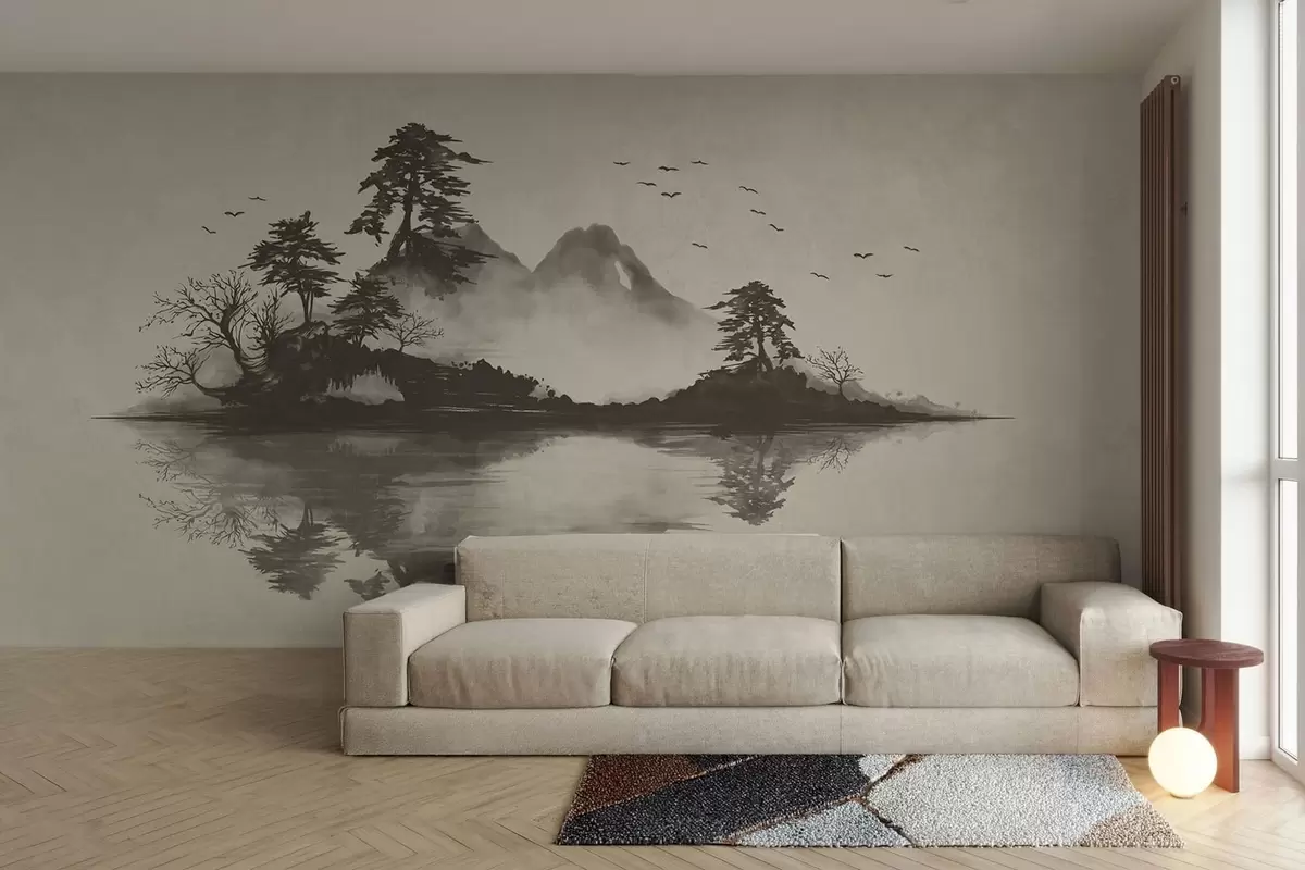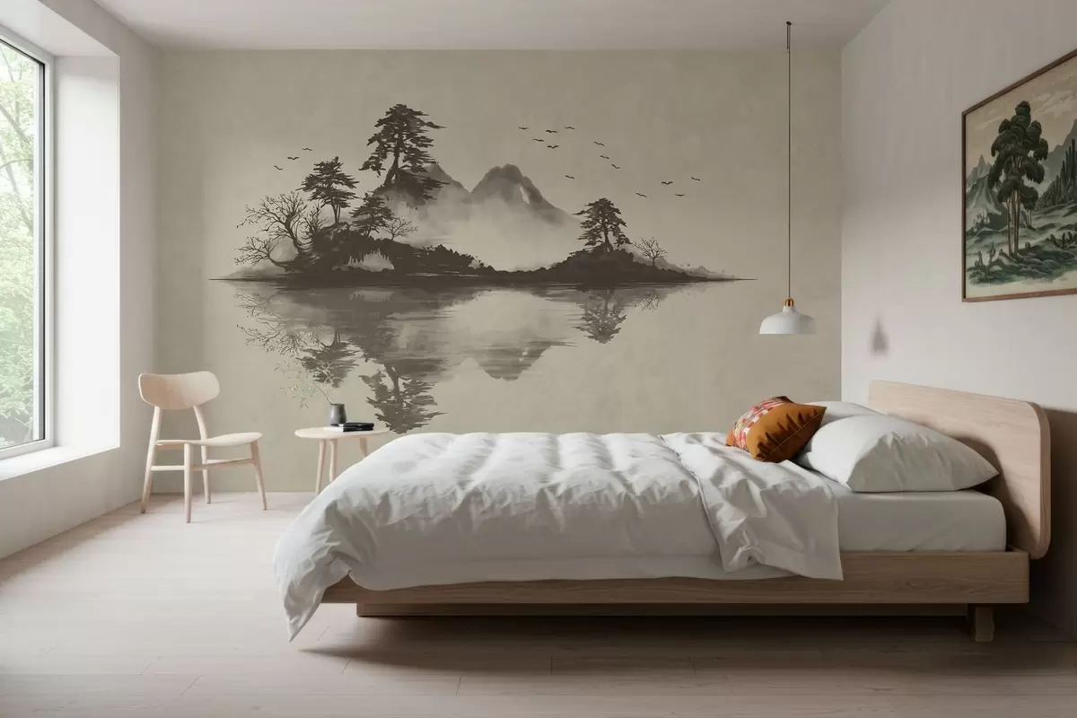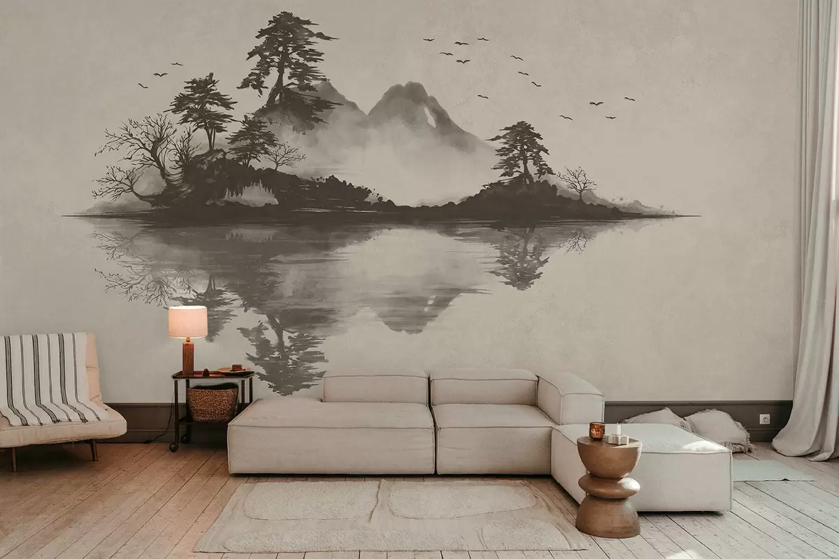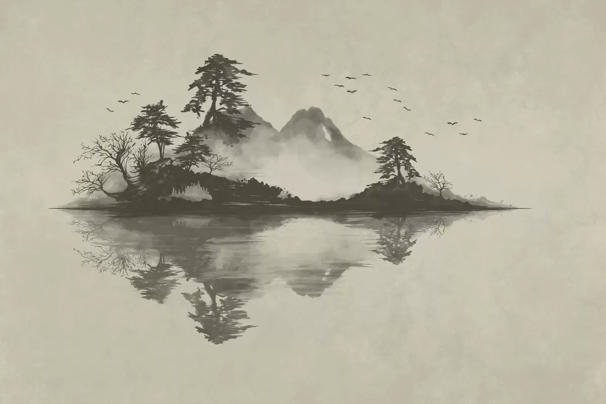 Fototapetai Sumi-e kalnų peizažas švelniais pilkais atspalviais Nr. w05124v1
