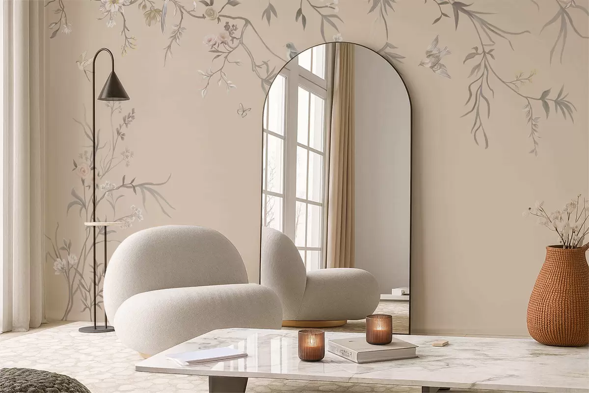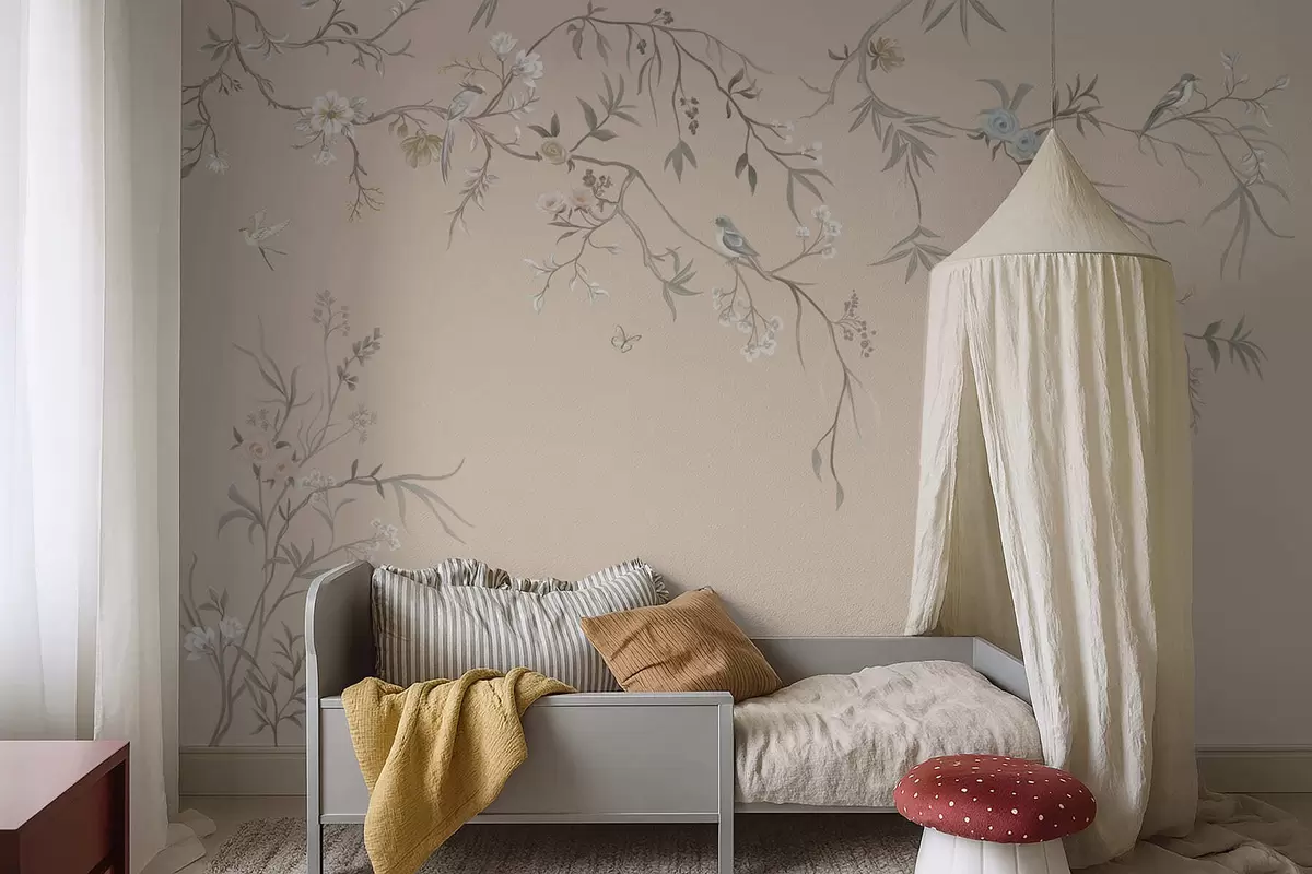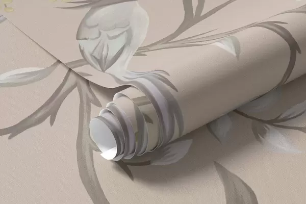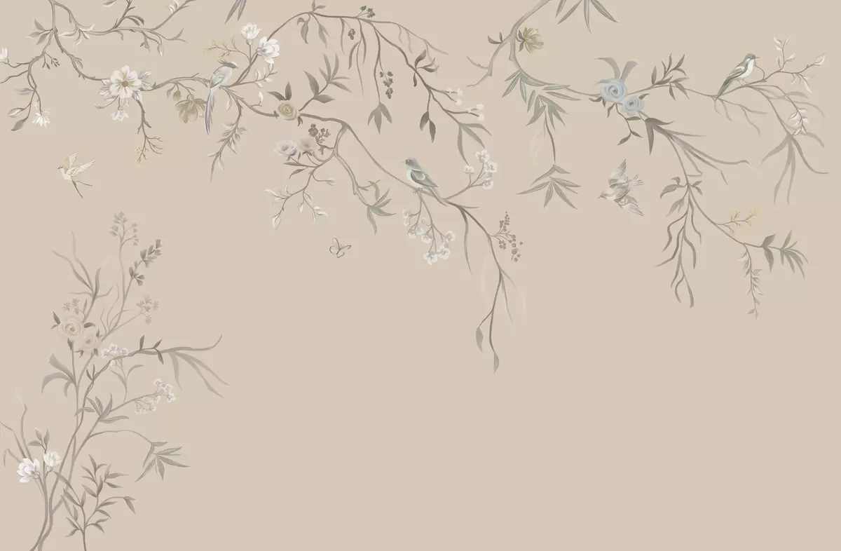 Fototapetai Gėlių šakos su paukščiais ant šilto smėlio spalvos fono Nr. w05127v1