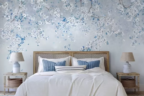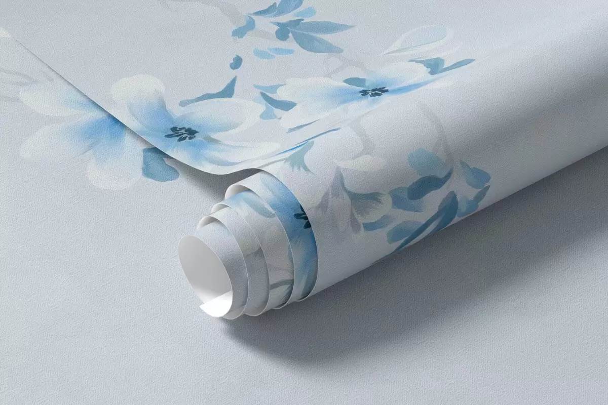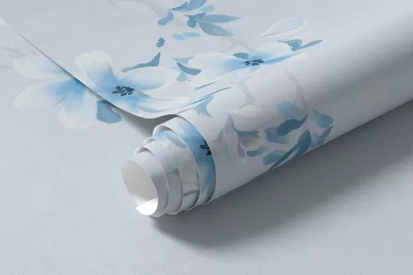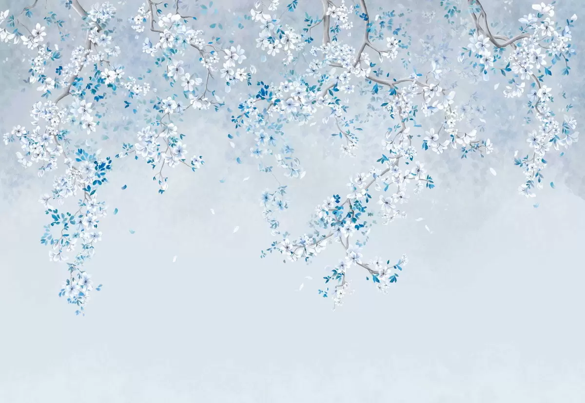 Fototapetai Šakos su baltais ir mėlynais žiedais ant vėsaus fono Nr. w05129v2