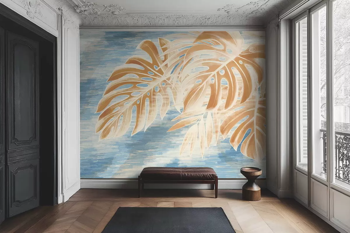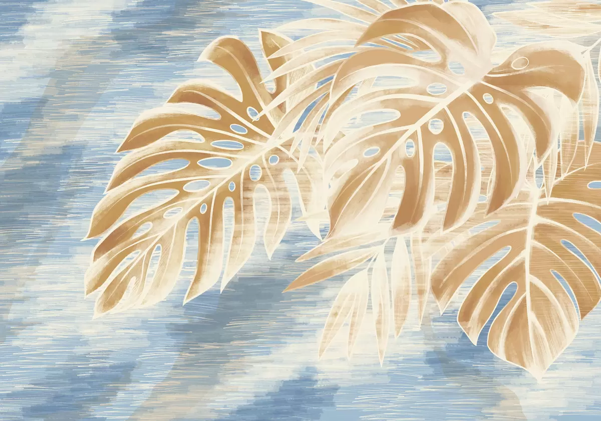 Fototapetai Lapai šviesiai smėlio spalvos tonais ant mėlyno fono Nr. w05130v1