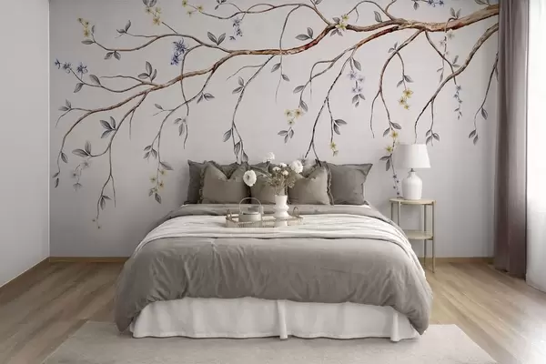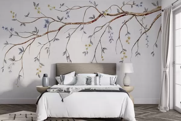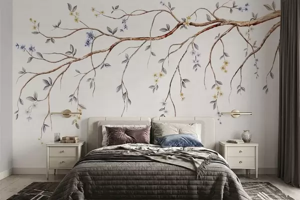 Fototapetai Plonos šakos su mažais žiedais šviesiu fonu Nr. w05145
