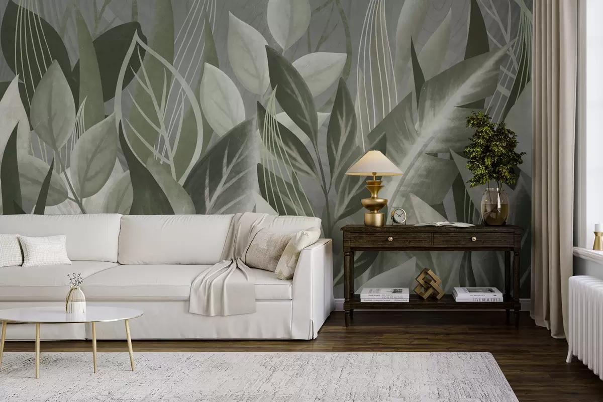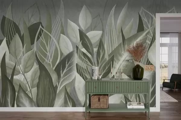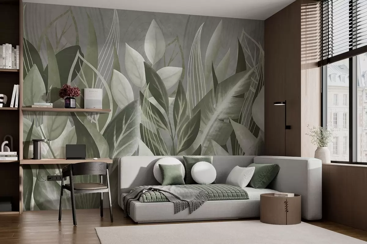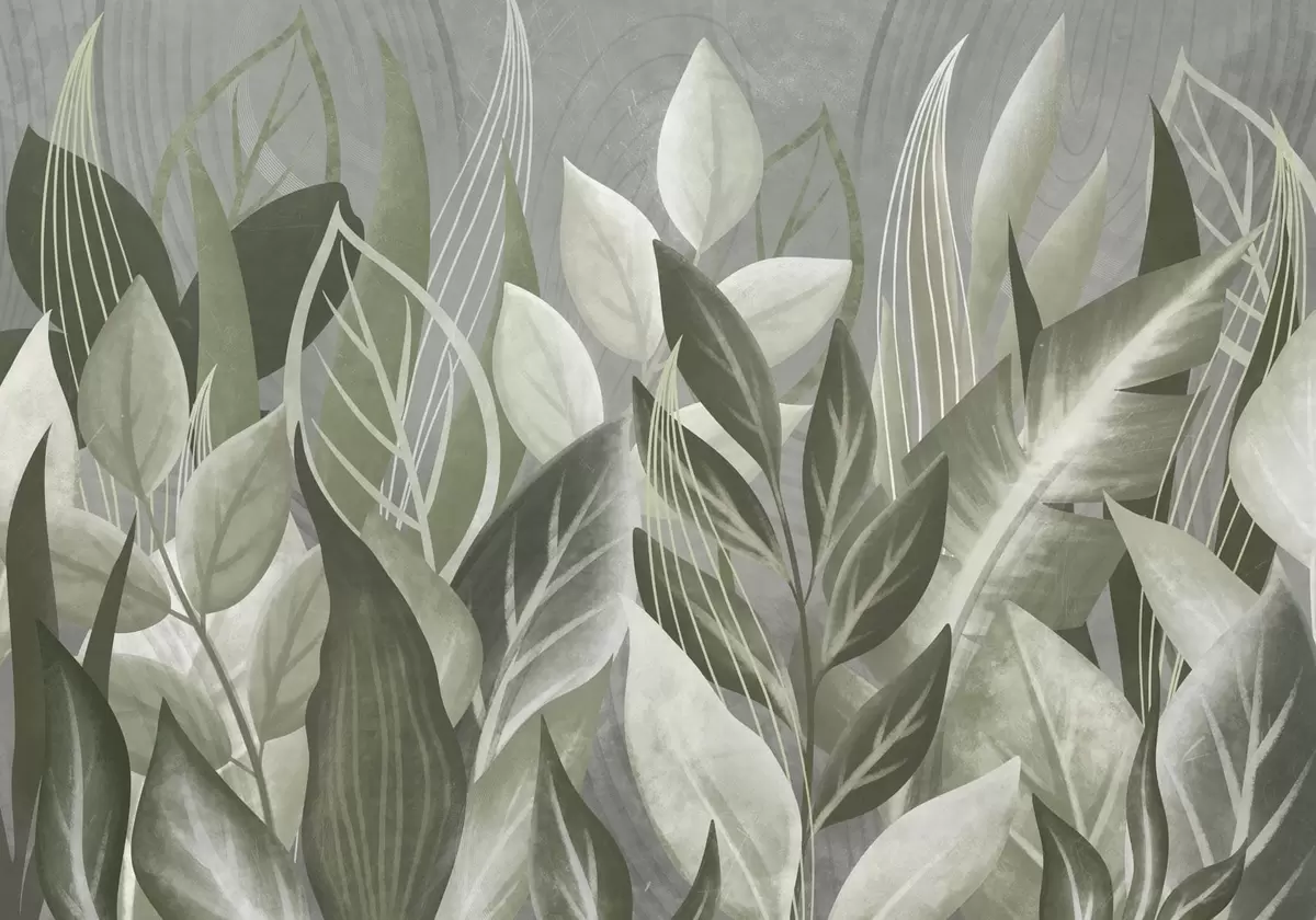 Fototapetai Abstrakčios lapų formos pilkai žalios spalvos atspalviais Nr. w05148v1