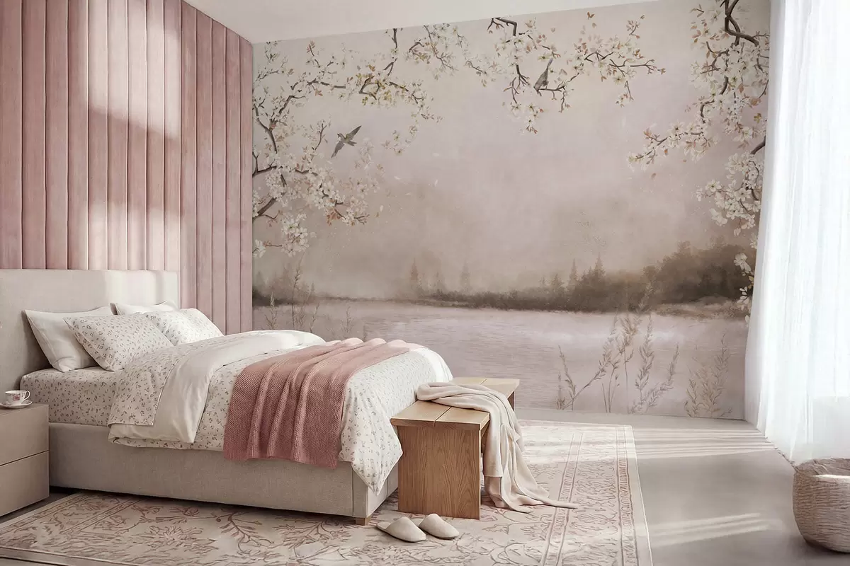 Fototapetai Žydintys šakos virš ramaus ežero su paukščiais rūke Nr. w05155v1