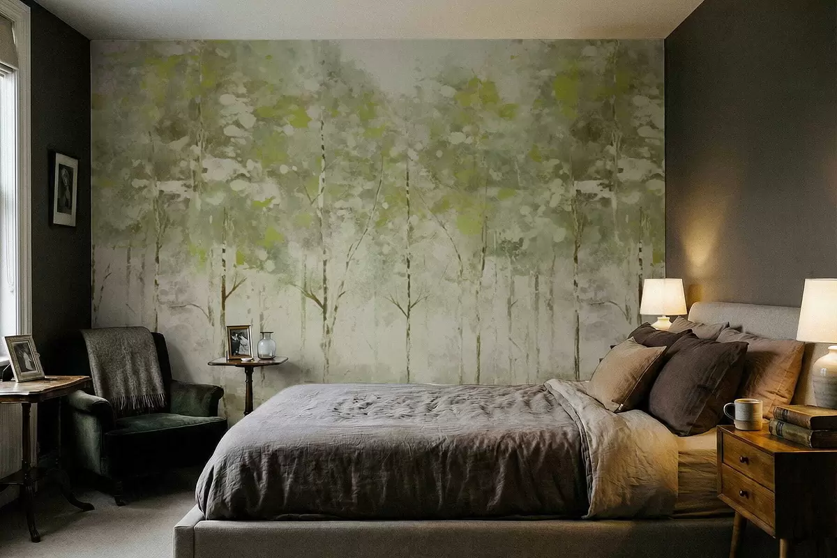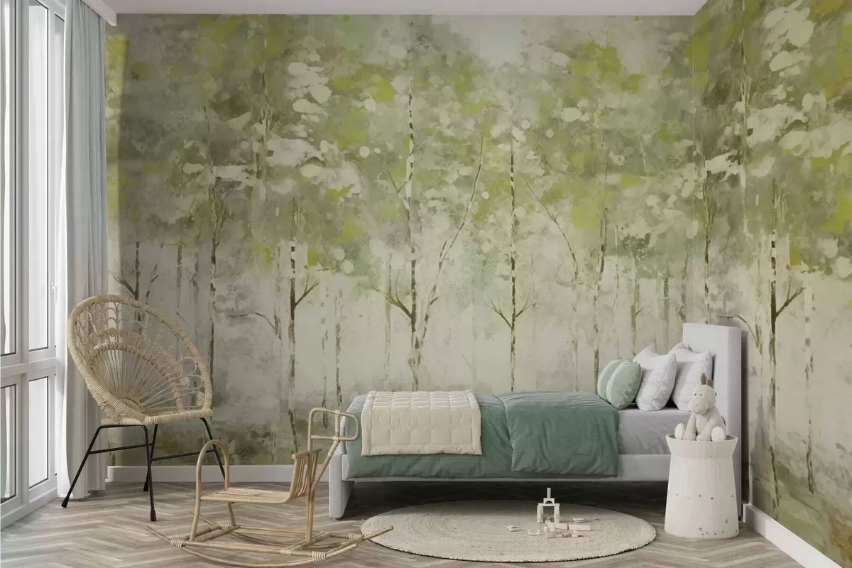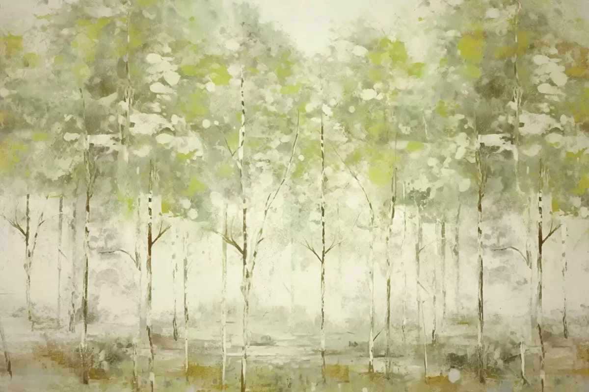 Fototapetai Stilizuotas miškas su lieknomis medžių siluetais žalios spalvos tonais Nr. w05221v1