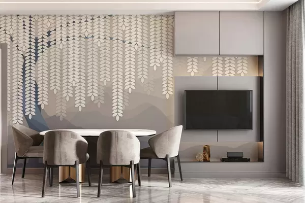 Fototapetai stilizuotas gluosnis su kabančiais lapais prieš minimalistinių kalnų foną, atspalvių nuo smėlio iki mėlynai žalios spalvos Nr. w05232