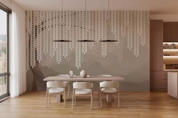 Fototapetai stilizuotas gluosnis su kabančiais lapais prieš minimalistinių kalnų foną kavos atspalviais Nr. w05232v2