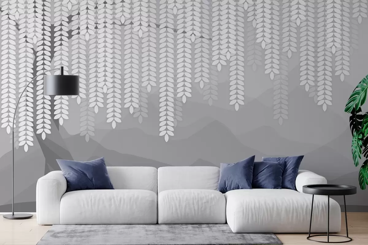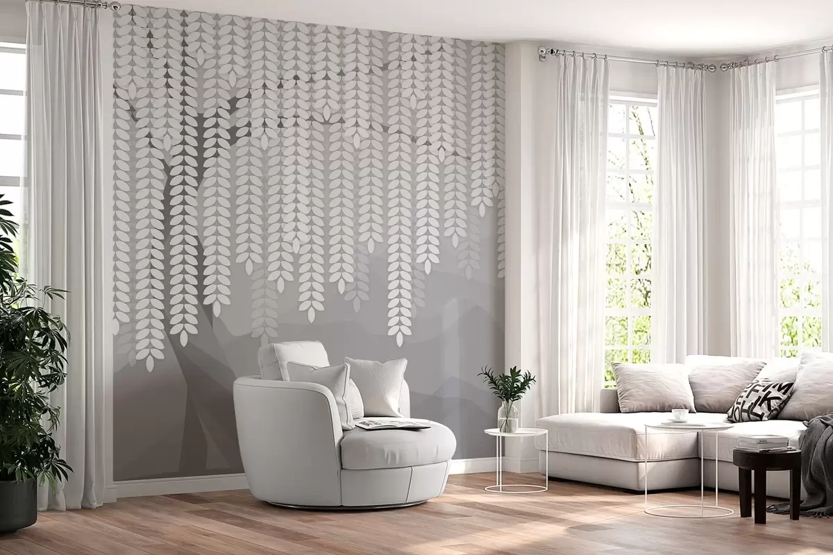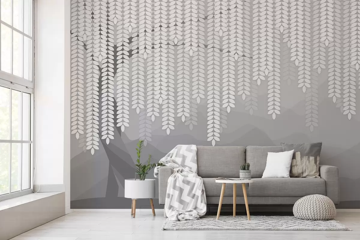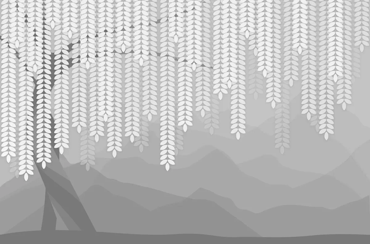 Fototapetai stilizuotas gluosnis su kabančiais lapais prieš minimalistinių kalnų foną pilkos spalvos atspalviais Nr. w05232v3