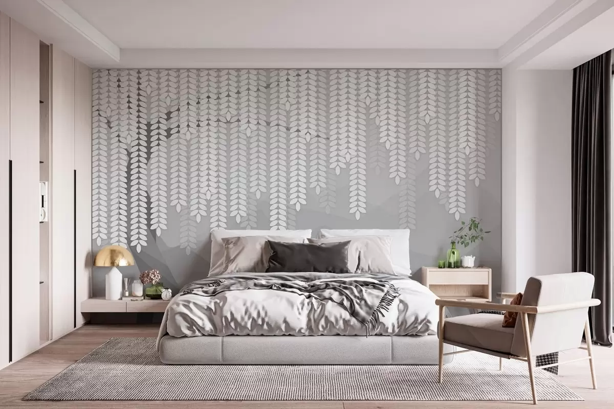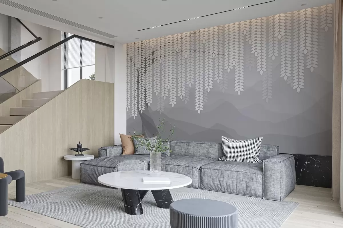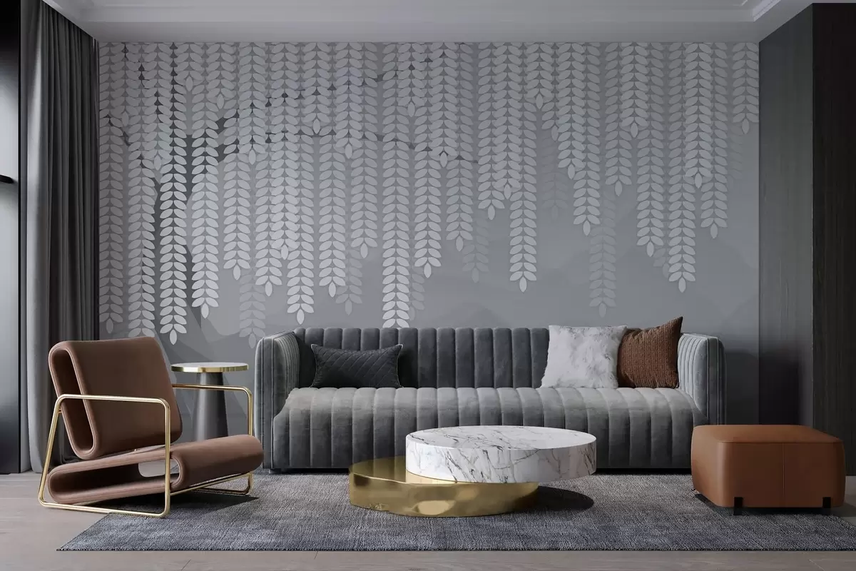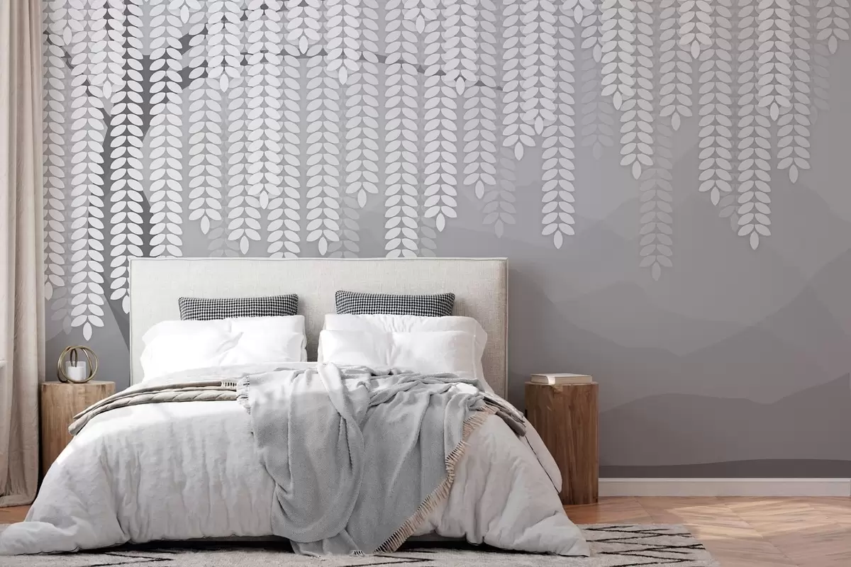 Fototapetai stilizuotas gluosnis su kabančiais lapais prieš minimalistinių kalnų foną pilkos spalvos atspalviais Nr. w05232v3