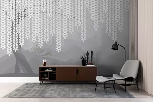 Fototapetai stilizuotas gluosnis su kabančiais lapais prieš minimalistinių kalnų foną pilkos spalvos atspalviais Nr. w05232v3