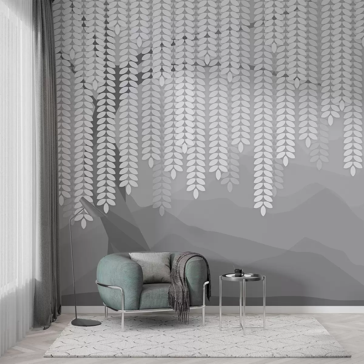 Fototapetai stilizuotas gluosnis su kabančiais lapais prieš minimalistinių kalnų foną pilkos spalvos atspalviais Nr. w05232v3