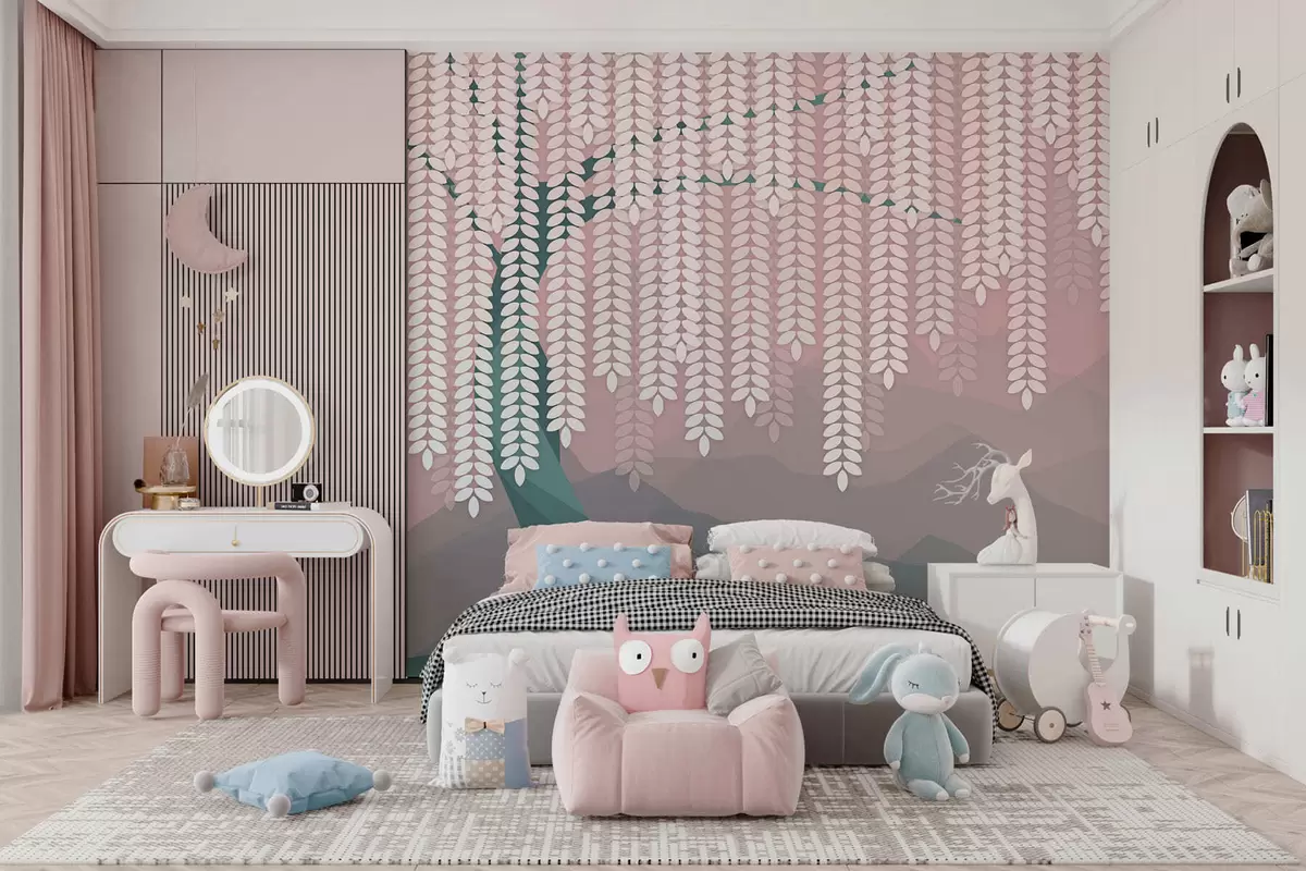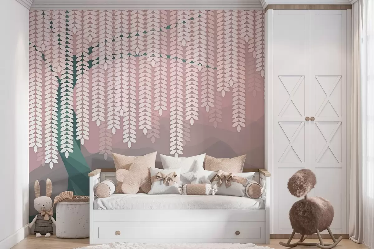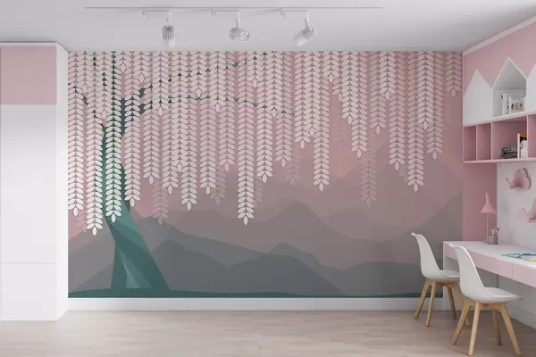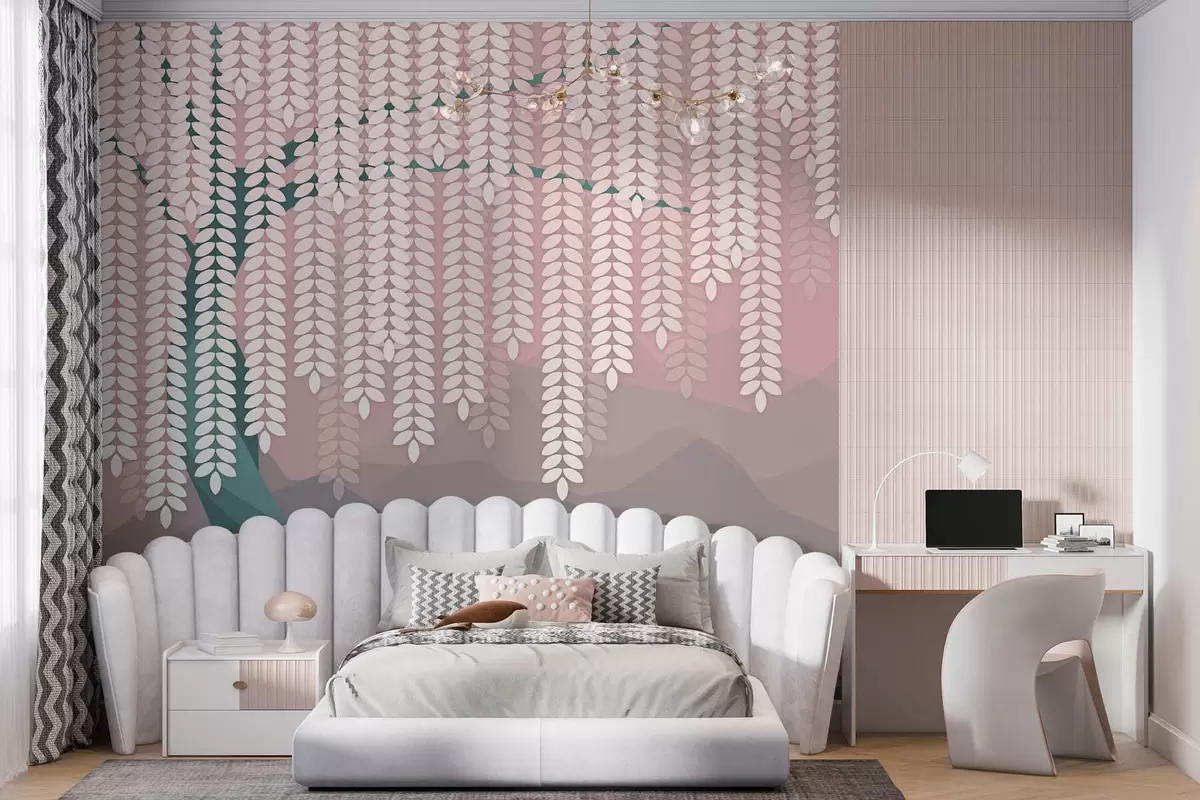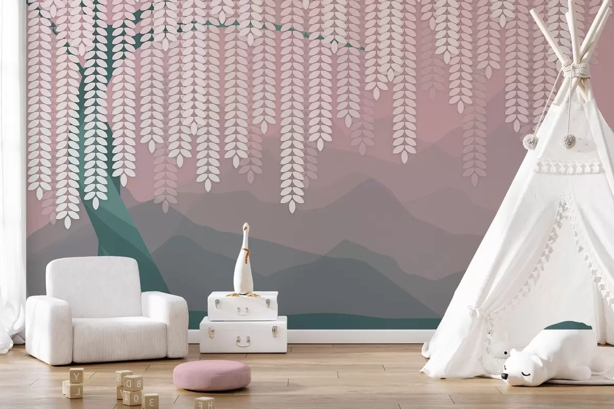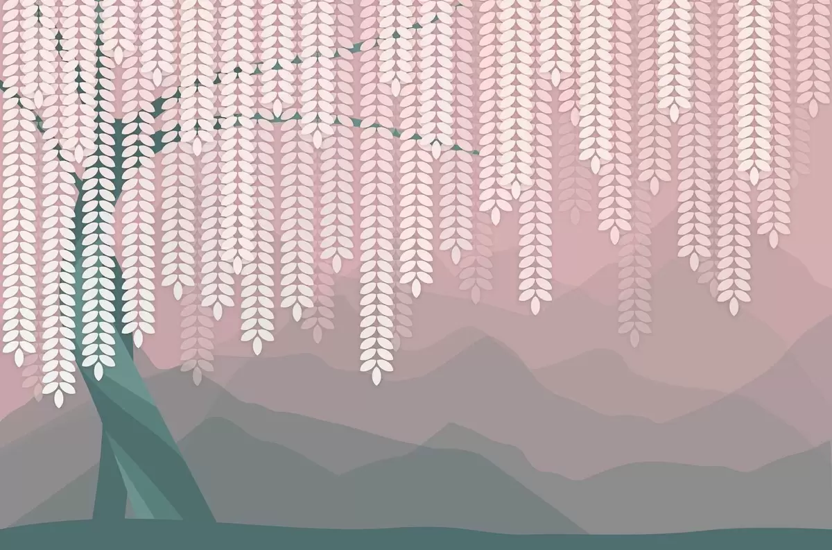Fototapetai stilizuotas gluosnis su kabančiais lapais prieš minimalistinių kalnų foną rausvos ir tamsiai žalios spalvos atspalviais Nr. w05232v4
