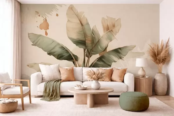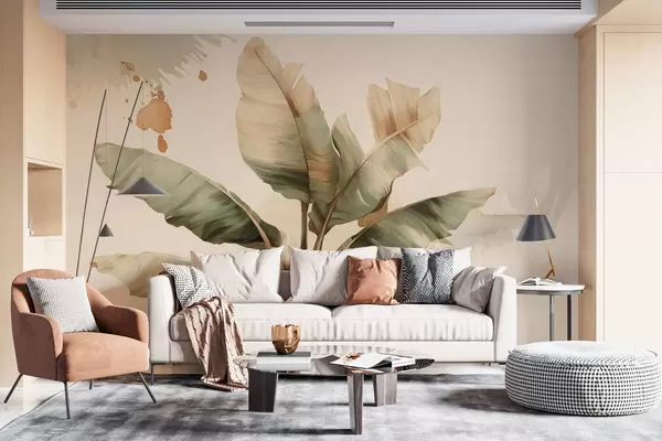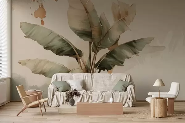 Fototapetai didelis, vaizdingas bananų lapų krūva su retro stiliaus purslais Nr. w05384