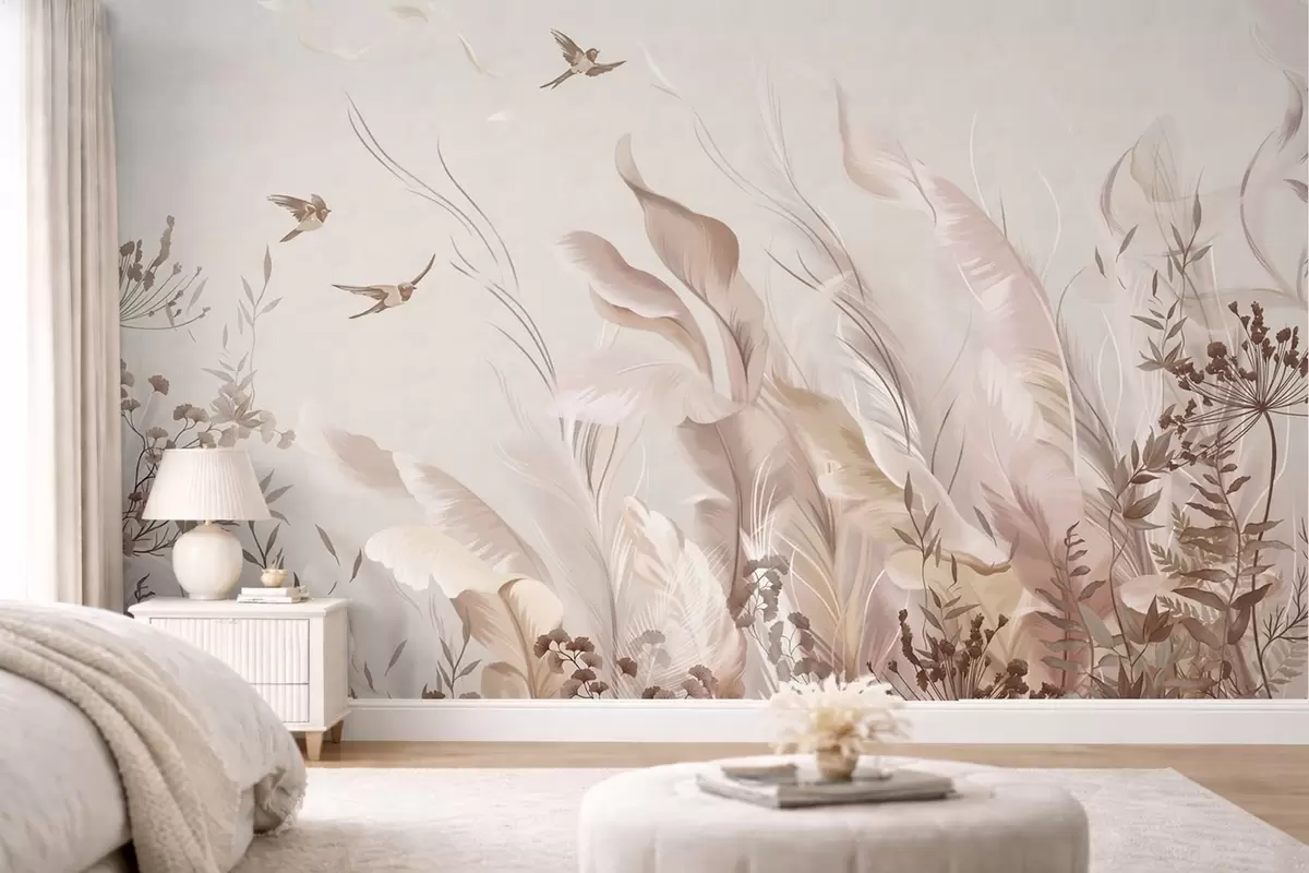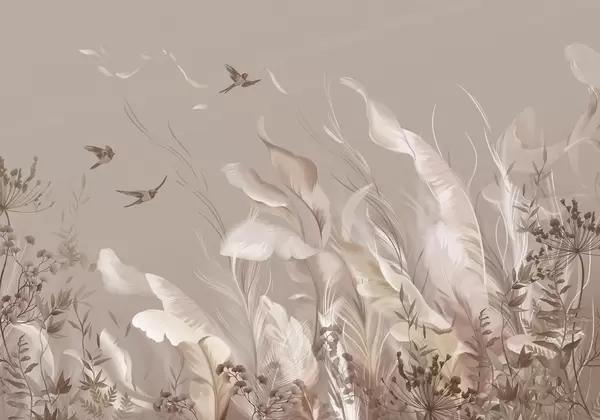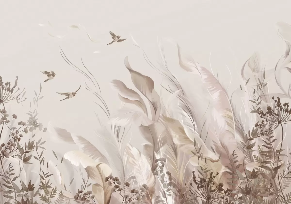 Fototapetai Švelnios plunksnos, žolės ir paukščiai šviesiomis spalvomis Nr. w05395