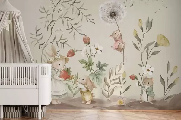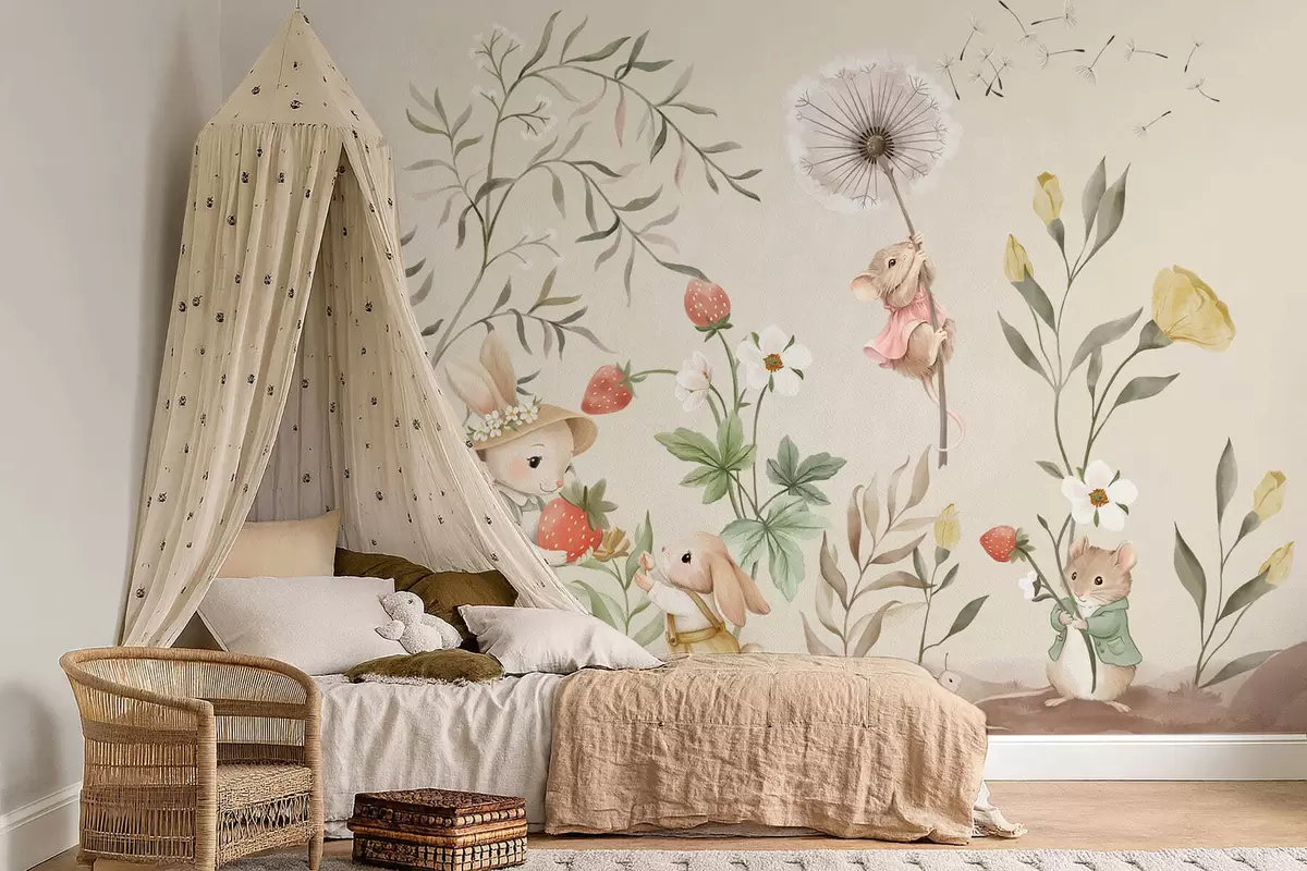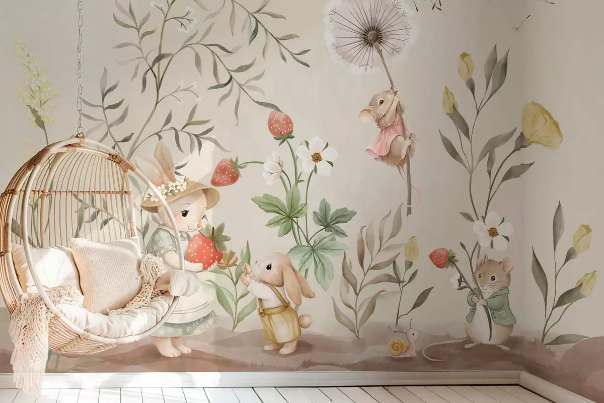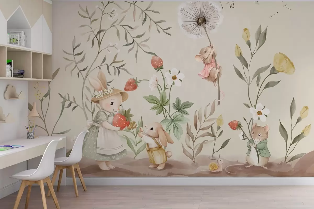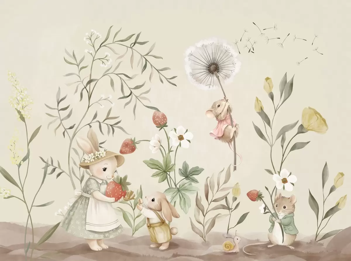 Fototapetai Paveikslėlis, kuriame pavaizduotas zuikis, pelė ir augalai su braškėmis Nr. w05422v2