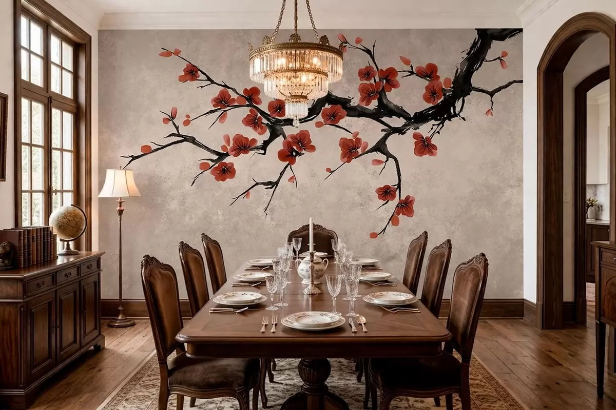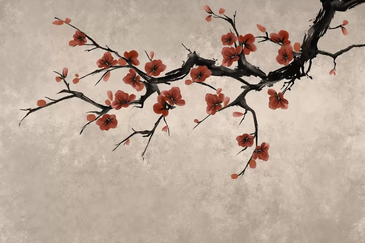 Fototapetai Rytietiško stiliaus žydinti šaka ant smėlio spalvos fono Nr. w05425v4