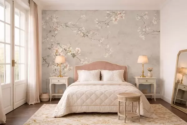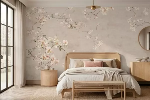 Fototapetai Švelnios gėlių šakelės kinietiško stiliaus motyvais ant šviesaus fono Nr. w05427