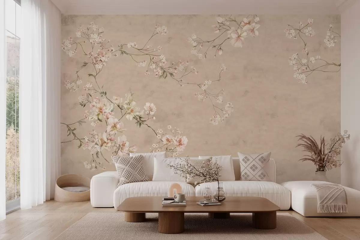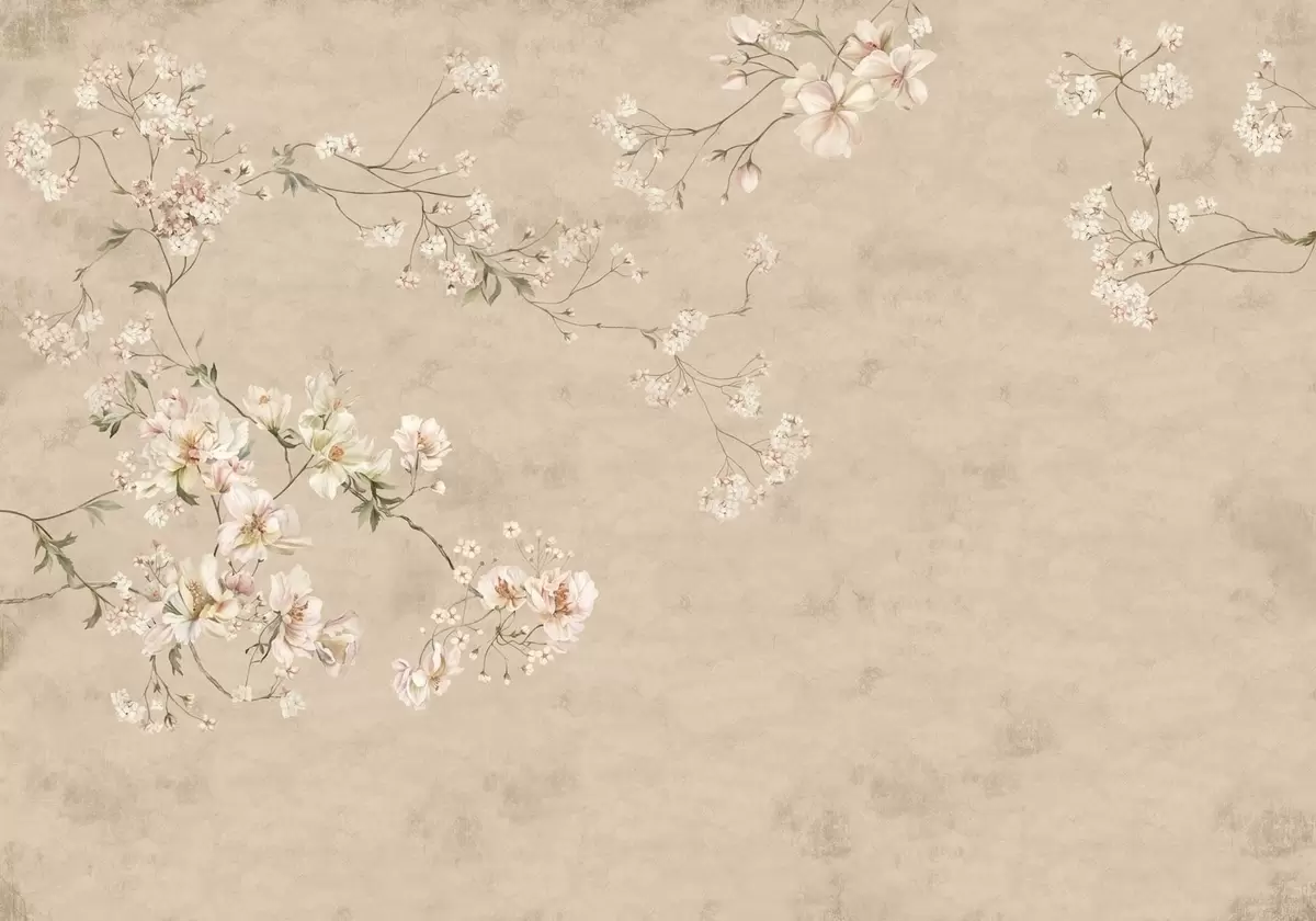 Fototapetai Kinietiško stiliaus gėlių šakos ant šilto smėlio spalvos fono Nr. w05427v2
