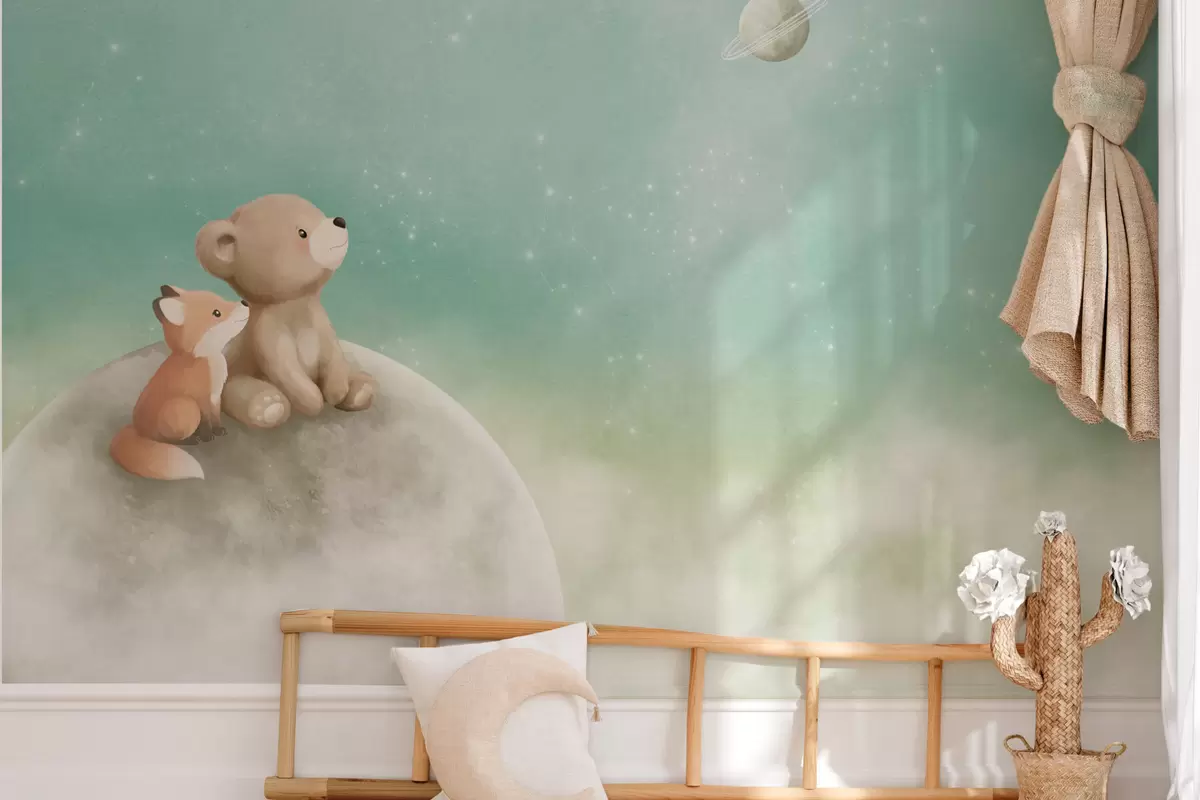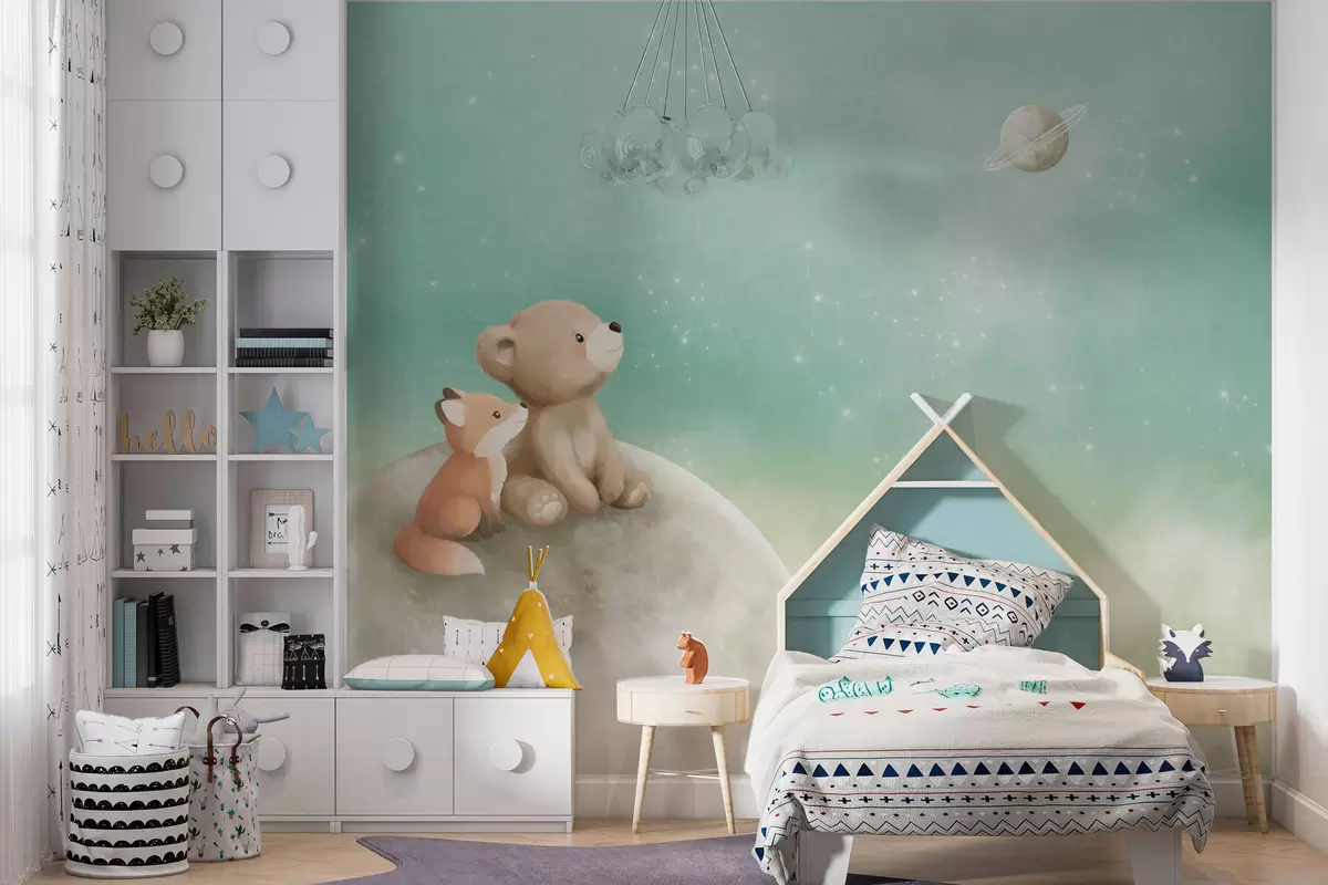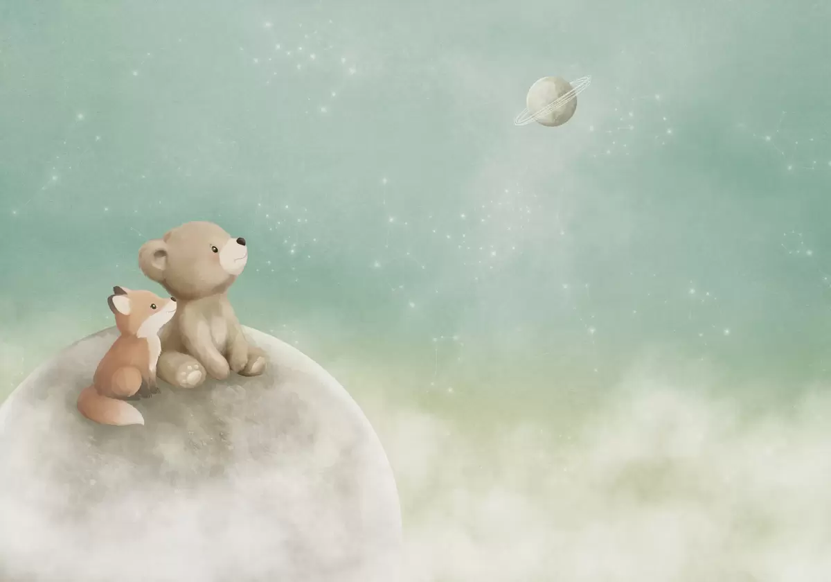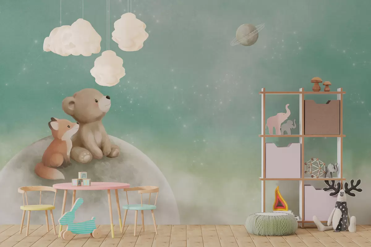 Fototapetai Pastelinė iliustracija: lokys ir lapė prieš žalią dangų Nr. w05431v1