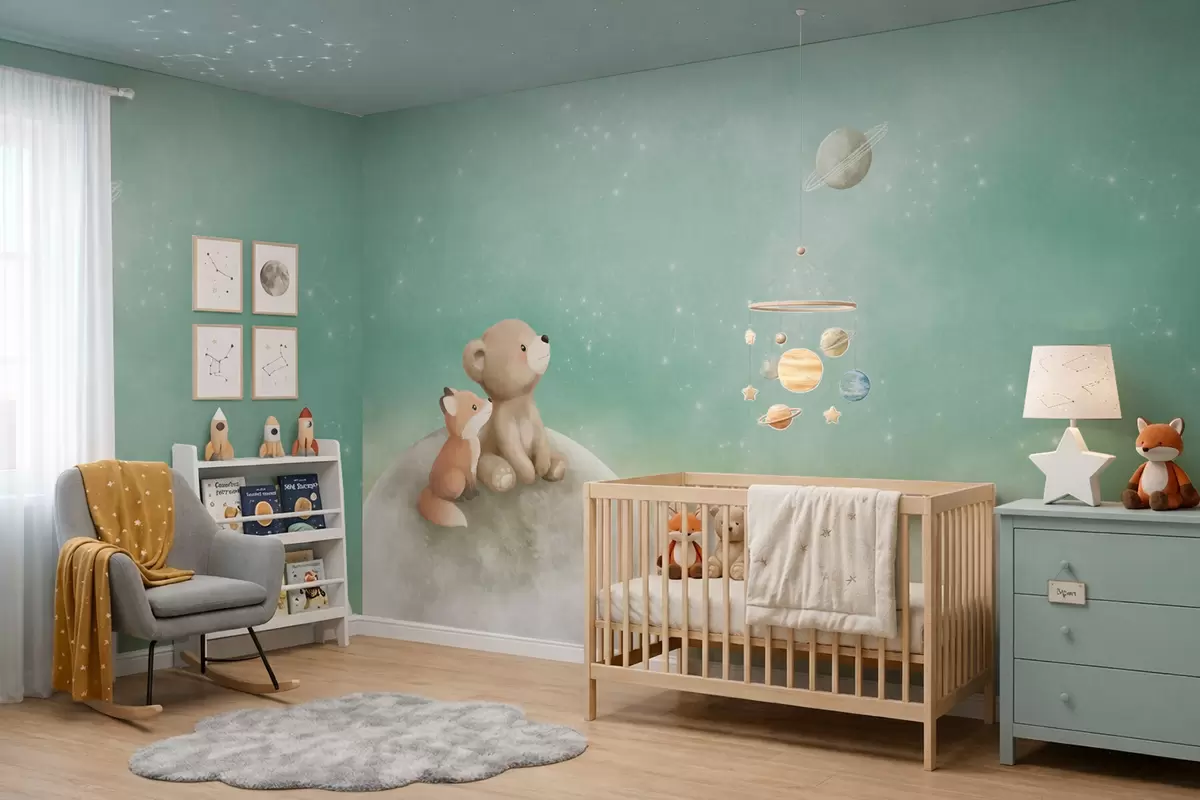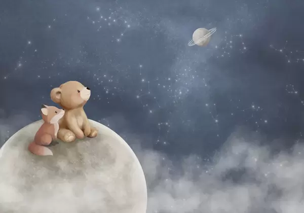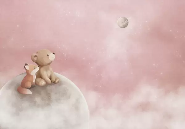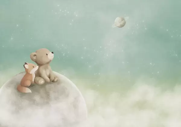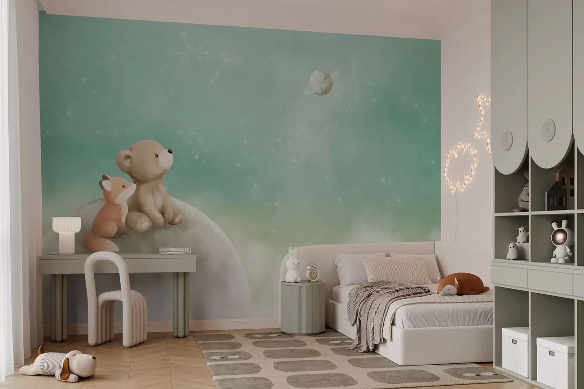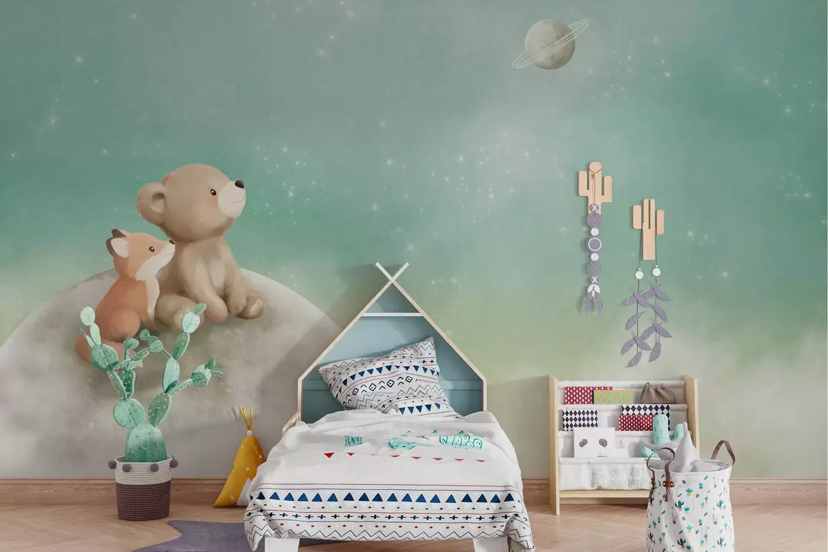 Fototapetai Pastelinė iliustracija: lokys ir lapė prieš žalią dangų Nr. w05431v1
