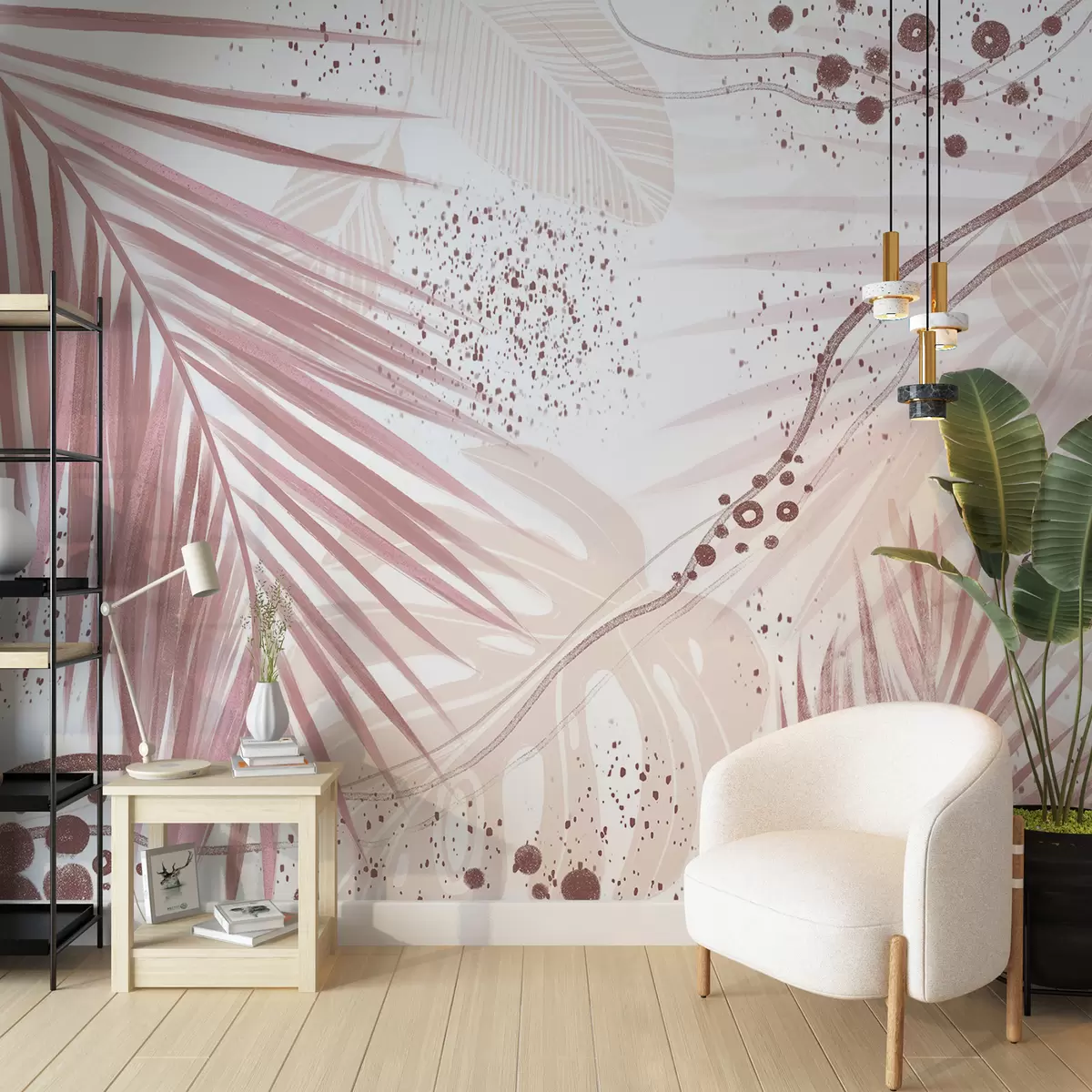 Fototapetai Atogrąžų rausvi palmių lapai ir gniužulai su abstrakčiomis formomis ir rožinės ir baltos spalvos atspalviais Nr. w07918v1