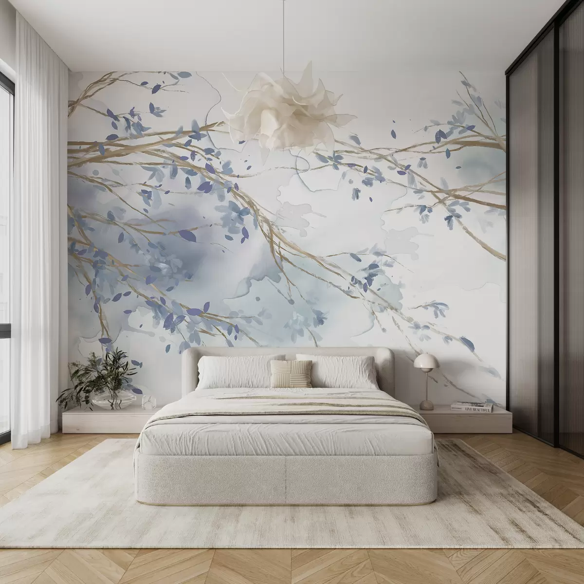 Fototapetai Švelnios mėlynos ir baltos gėlių šakos su minkštu, neryškiu akvarelės fonu Nr. w07919