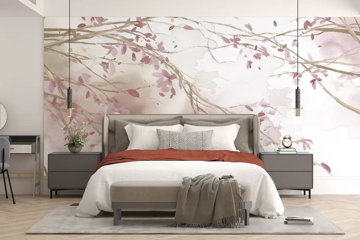 Fototapetai Švelnios rožinės ir baltos gėlių šakos su minkštu, neryškiu akvarelės fonu Nr. w07919v1