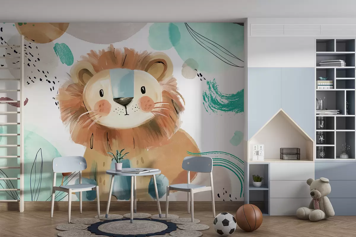 Fototapetai Mielas animacinis liūtas spalvingame, abstrakčiame fone su teptuko potėpiais ir pastelinių spalvų purslais Nr. w07924