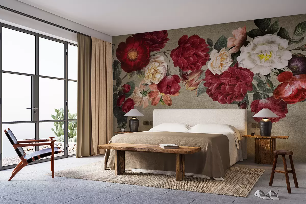 Fototapetai Vintažinio meno ryškios gėlės su lapais neutralios tekstūros fone w07929