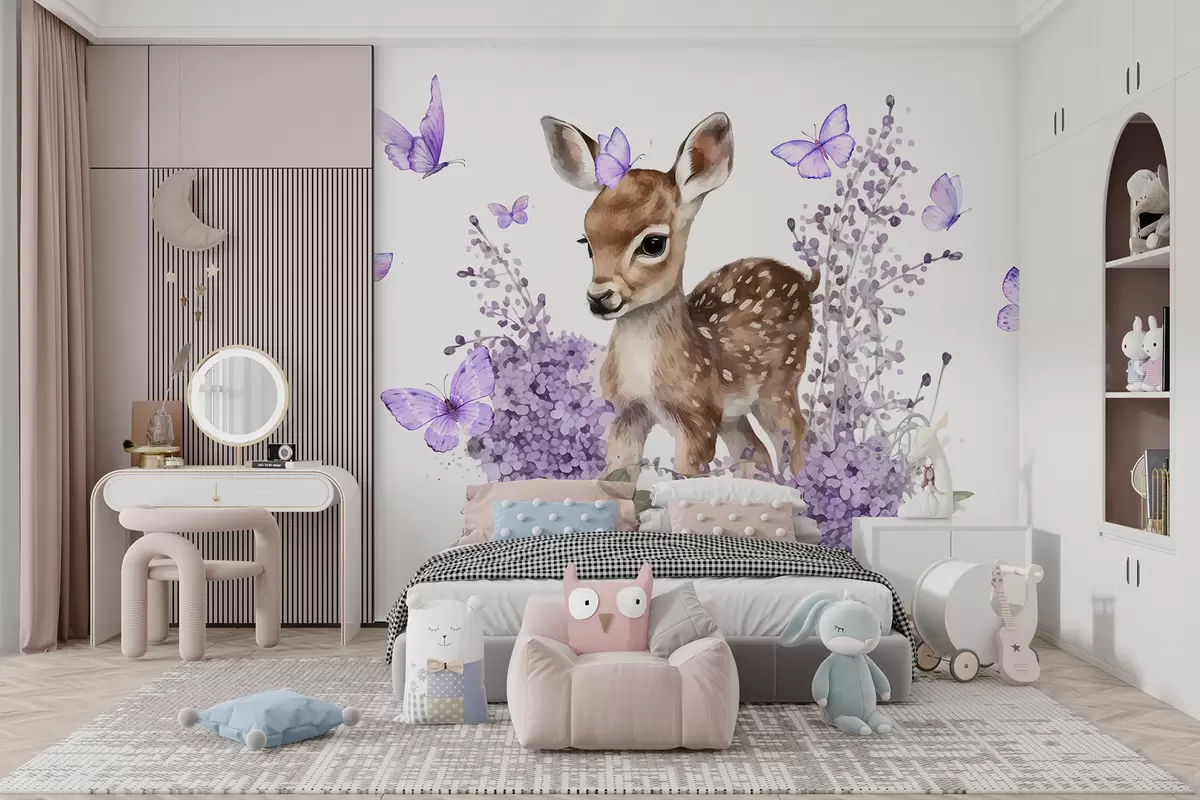 Fototapetai Jaunas elnias didelėmis akimis ir dėmėtu kailiu, apsuptas purpurinių gėlių ir drugelių Nr. w07931