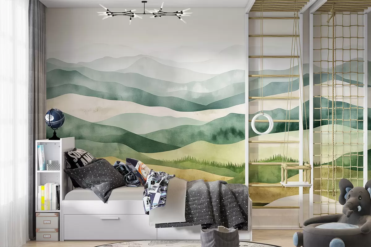 Fototapetai Akvarelės kalnų peizažai, miškas, natūralios žalios ir smėlio spalvos Nr. w07950