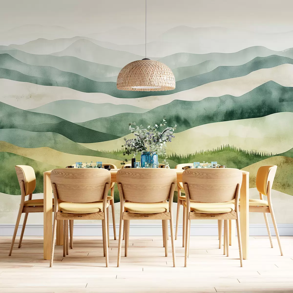 Fototapetai Akvarelės kalnų peizažai, miškas, natūralios žalios ir smėlio spalvos Nr. w07950