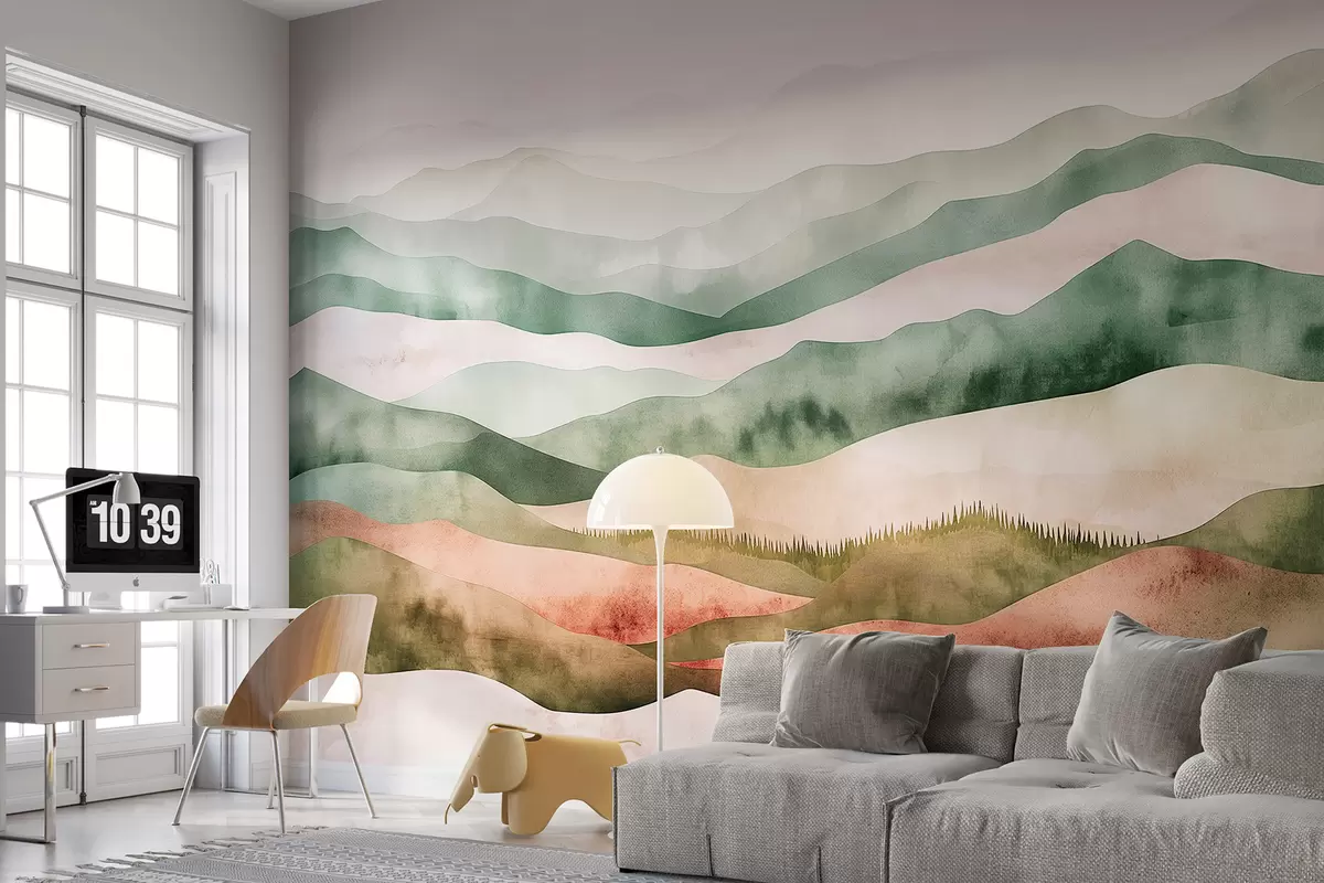 Fototapetai Akvarelės kalnų peizažai, miškas, gamta, žalia ir smėlio spalvos Nr. w07950v1