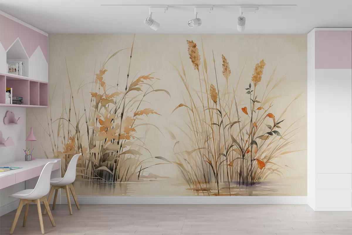 Fototapetai Nendrių krūmai tvenkinio tekstūros, akvarelės, smėlio, oranžinės spalvos Nr. w07964