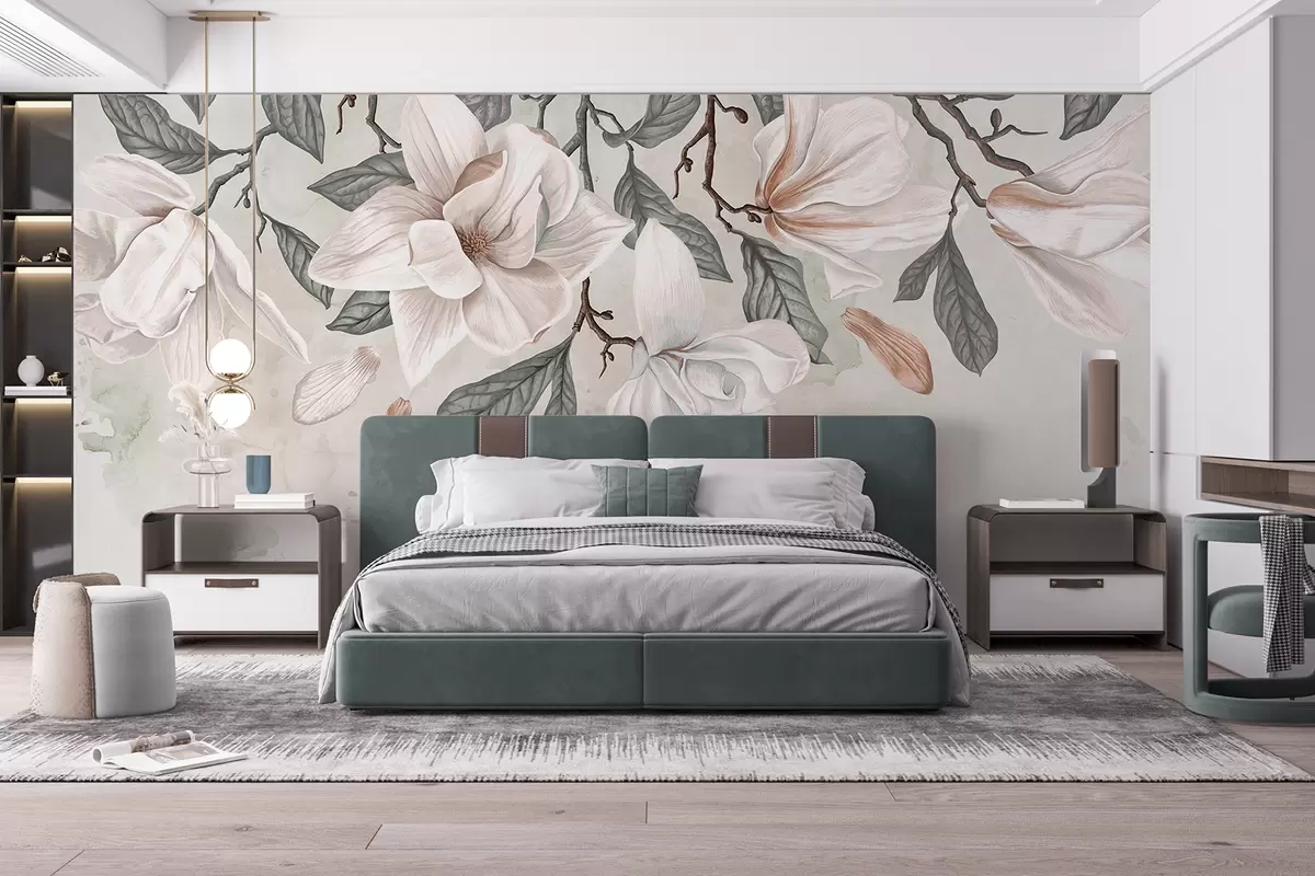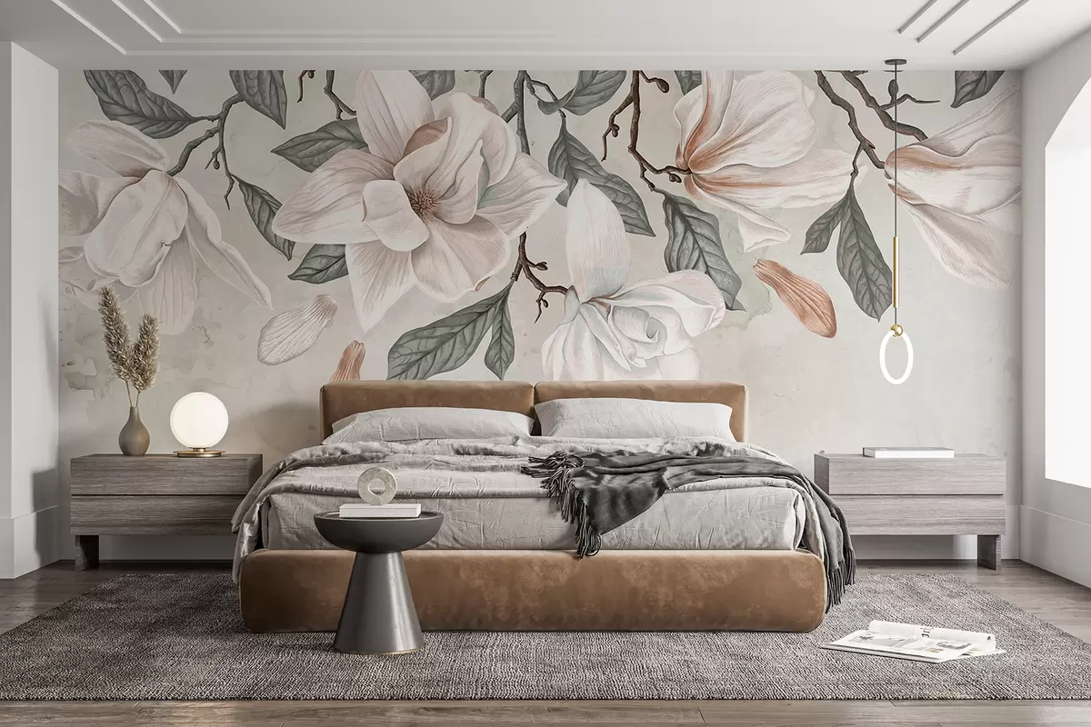 Fototapetai Šviesiame fone švelnūs rožiniai ir balti magnolijos žiedai su žaliais lapais, švelni, gėlių kompozicija Nr. w07977