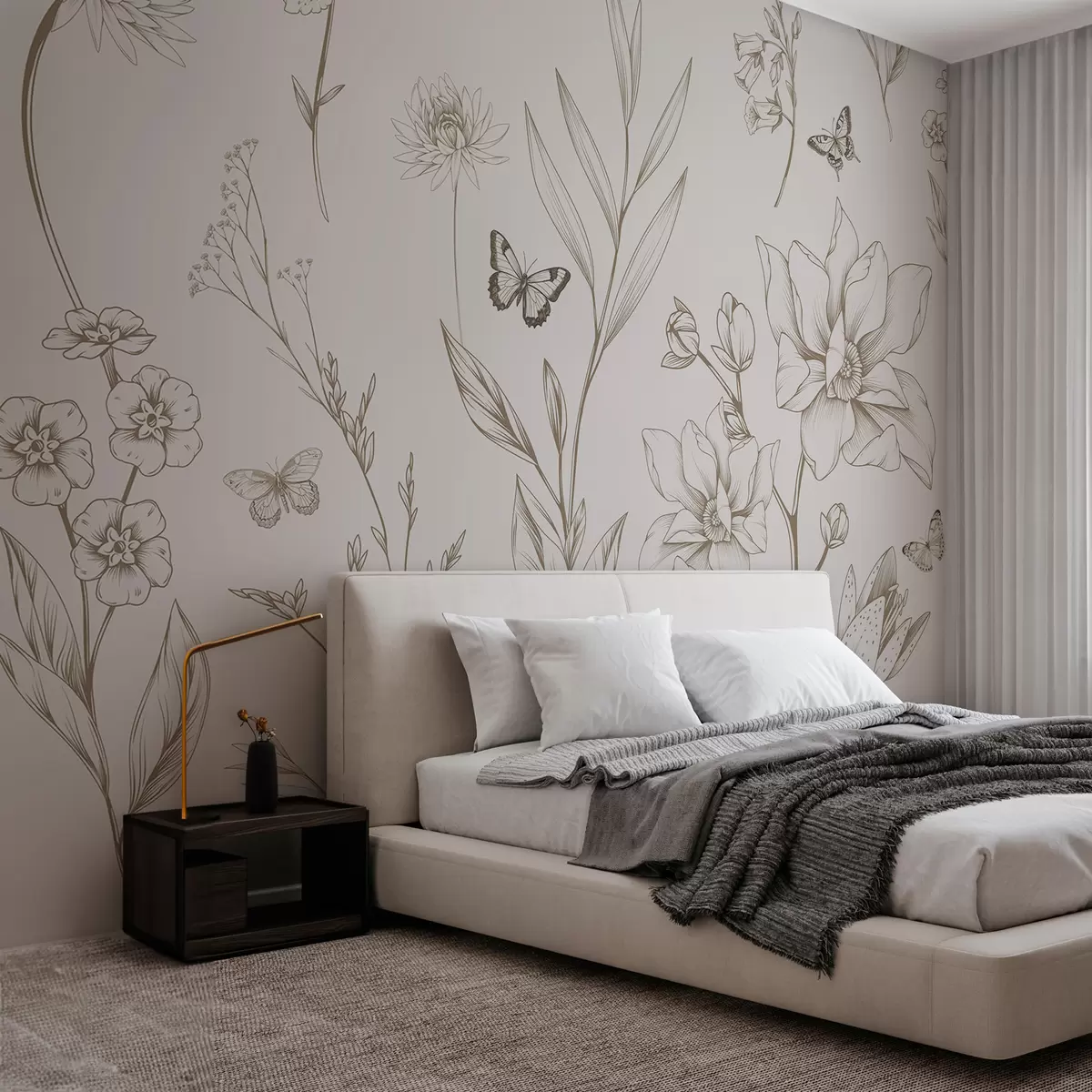 Fototapetai Boho monochrominės gėlės ir drugeliai smėlio spalvos Nr. w08088v1