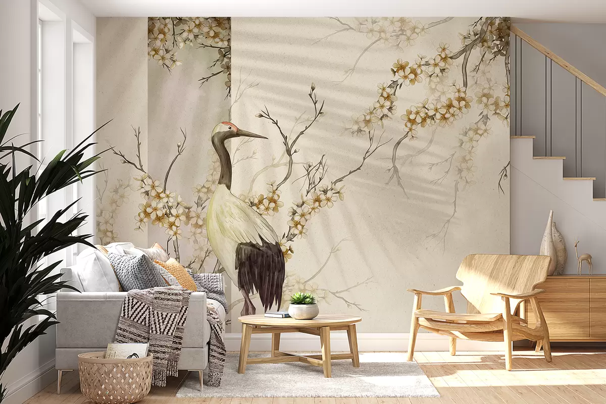 Fototapetai Balta gervė, stovinti ant šakos su žydinčiomis gėlėmis, minkštame, neryškiame fone Nr. w08159
