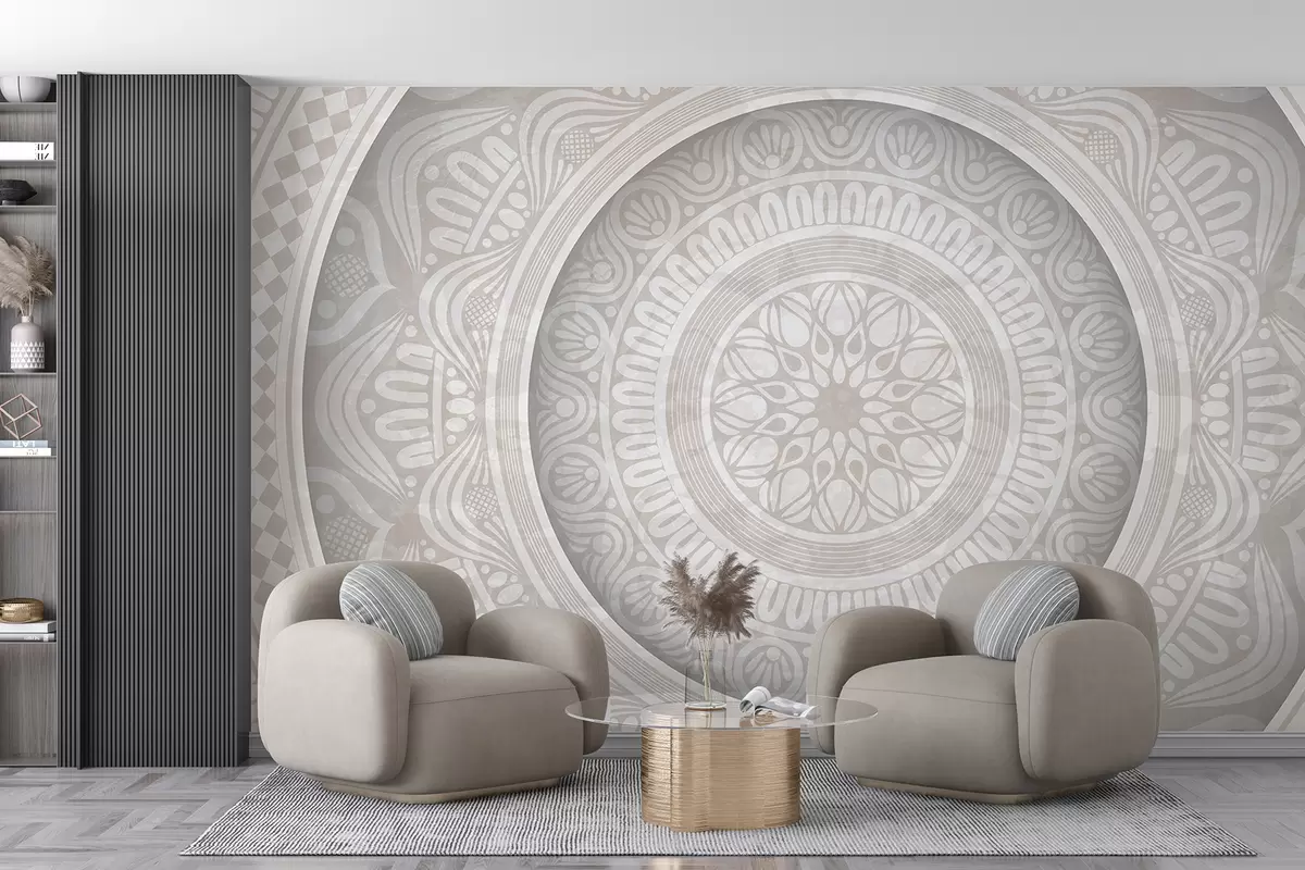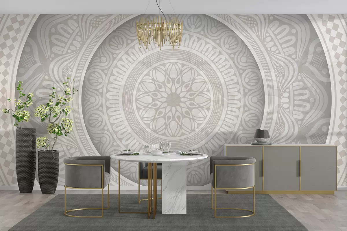Fototapetai Detalus simetriškas pilkos ir baltos spalvos mandalos atspaudas su koncentriniais apskritimais ir geometrinėmis formomis Nr. w08182