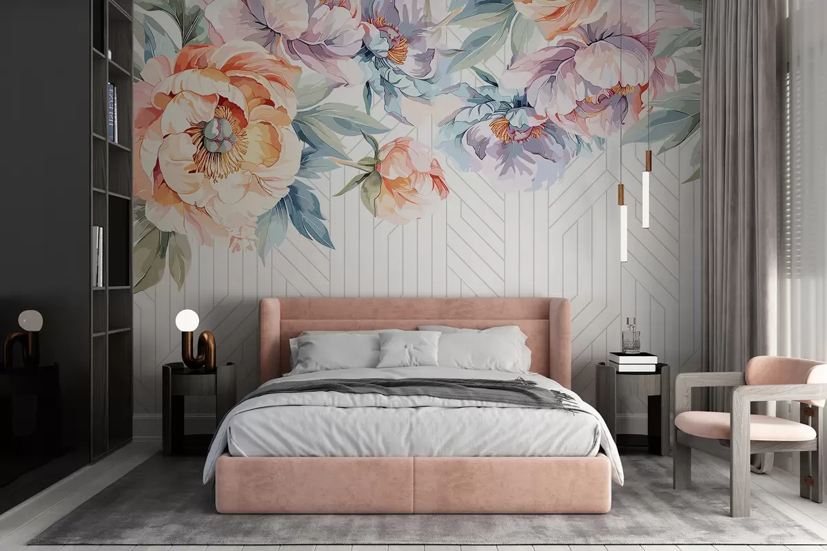 Fototapetai Ryškūs persikų ir rožinės spalvos abstraktūs bijūnai su žaliais lapais baltame ir pilkame rašto fone Nr. w08183