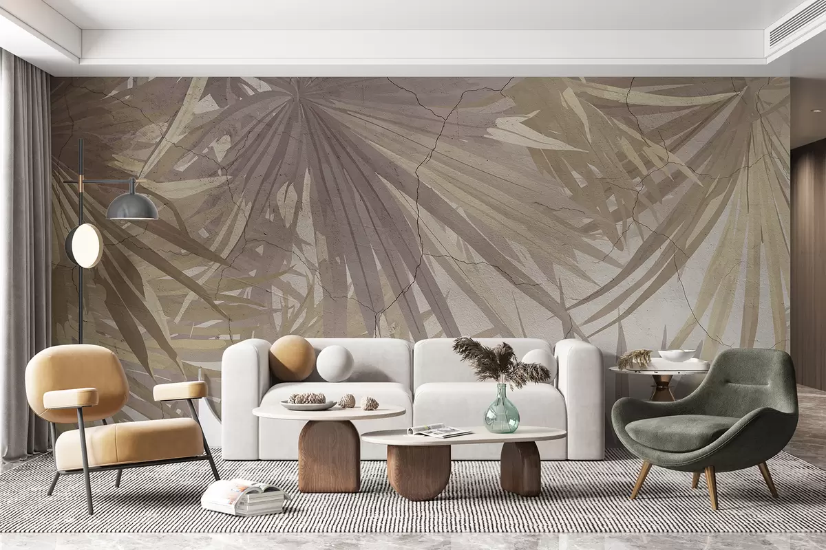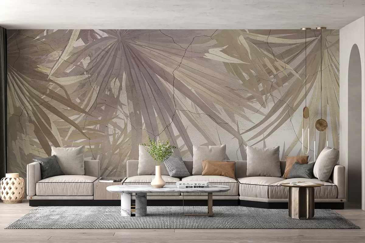 Fototapetai Vešli atogrąžų lapija su dideliais rudais palmių lapais minkštame, miglotame fone Nr. w08187v1