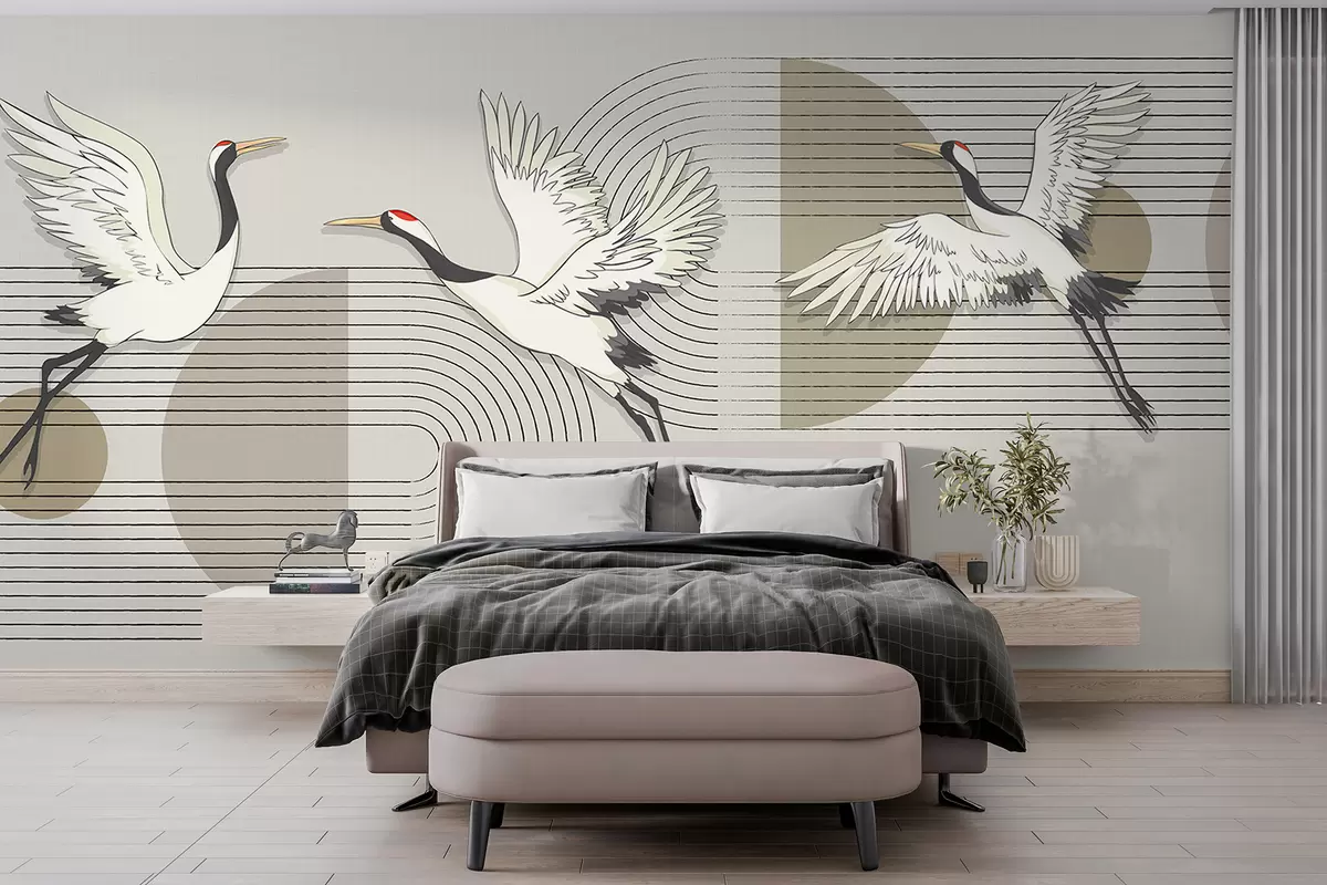 Fototapetai Trys balti kranai skrenda geometriniame minimalistiniame fone su koncentriniais apskritimais Nr. w08188