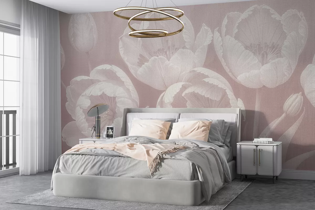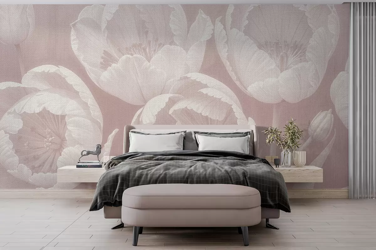 Fototapetai Baltų tulpių piešinys su minkštu, drobės tekstūros smėlio spalvos neryškiu fonu minimalistiniu vienspalviu spaudiniu Nr. w08193